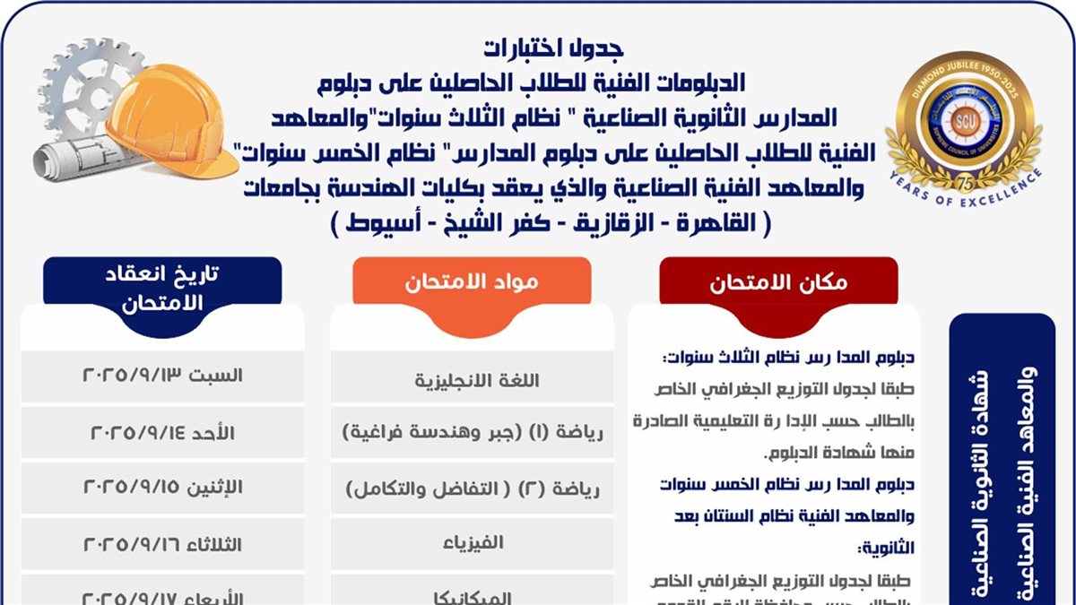 أعلنت أمانة المجلس الأعلى للجامعات فتح باب التقدم لاختبارات الدبلومات والمعاهد الفنية للعام الجامعي 2025/2026 للطلاب الحاصلين على الشهادات الفنية (نظامي الثلاث والخمس سنوات والمعاهد الفنية السنتين) وفق الشروط والقواعد للقبول بكليات الهندسة وذلك من اعتبارًا من يوم الجمعة الموافق 1/8/2025 على أن يتم غلق الموقع الإلكتروني قبل موعد الامتحانات بخمس أيام وفق جداول الاختبارات المعلنة.