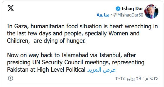 وكتب دار في حسابه على منصة "إكس": "أثناء عودتي إلى إسلام آباد عبر إسطنبول، وبعد ترؤسي اجتماعات مجلس الأمن التابع للأمم المتحدة، وتمثيل باكستان في المنتدى السياسي رفيع المستوى، وإلقاء كلمة في المؤتمر الدولي حول حل الدولتين لفلسطين، تحدثت من مطار إسطنبول إلى رئيس الوزراء حول الوضع الراهن لإمدادات الغذاء في غزة".