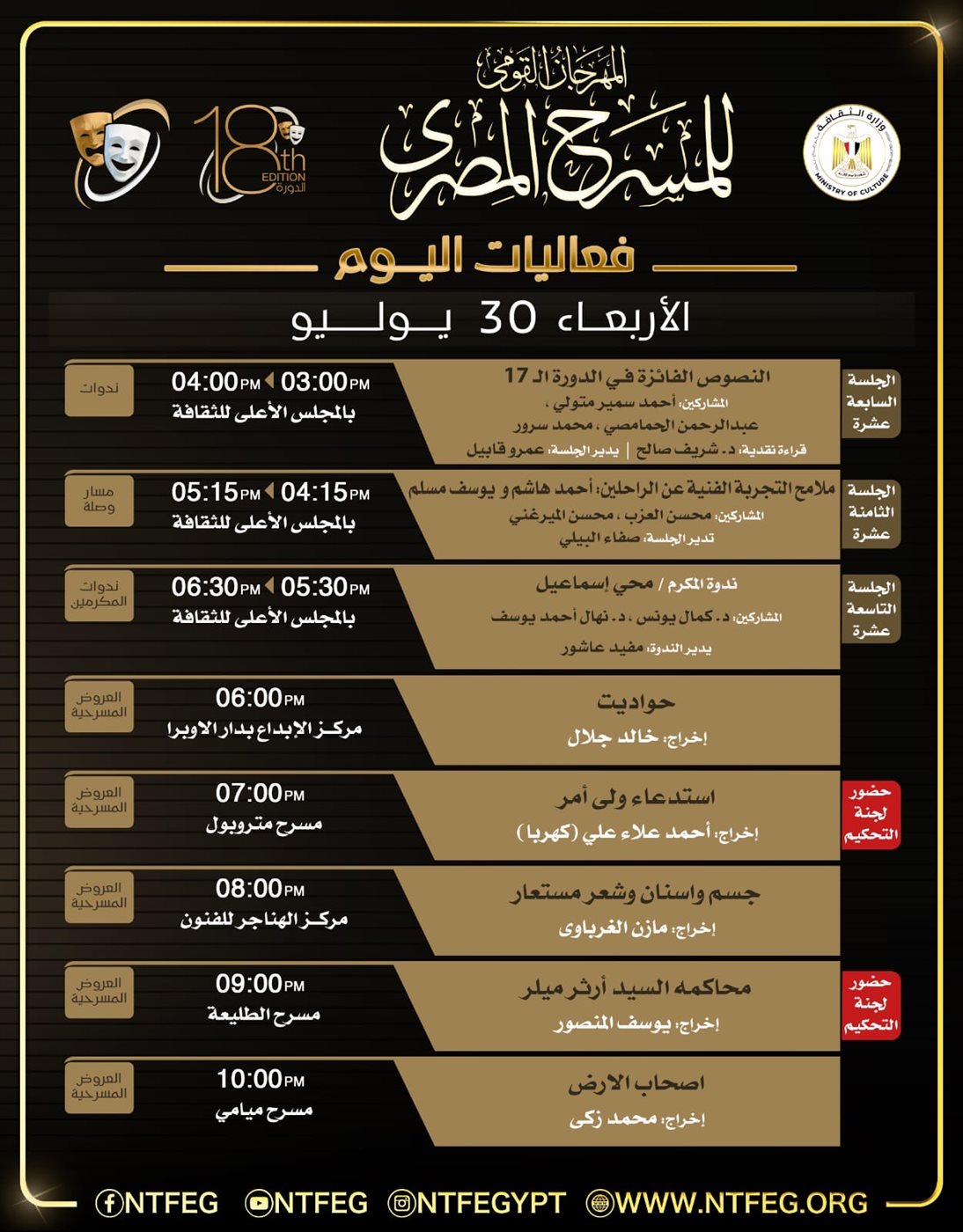 ينظم المهرجان القومي للمسرح المصري في دورته الثامنة عشرة برئاسة الفنان محمد رياض، اليوم الأربعاء 30 يوليو الجاري، العديد من الفعاليات والعروض المسرحية ضمن برنامج دورة هذا العام.
