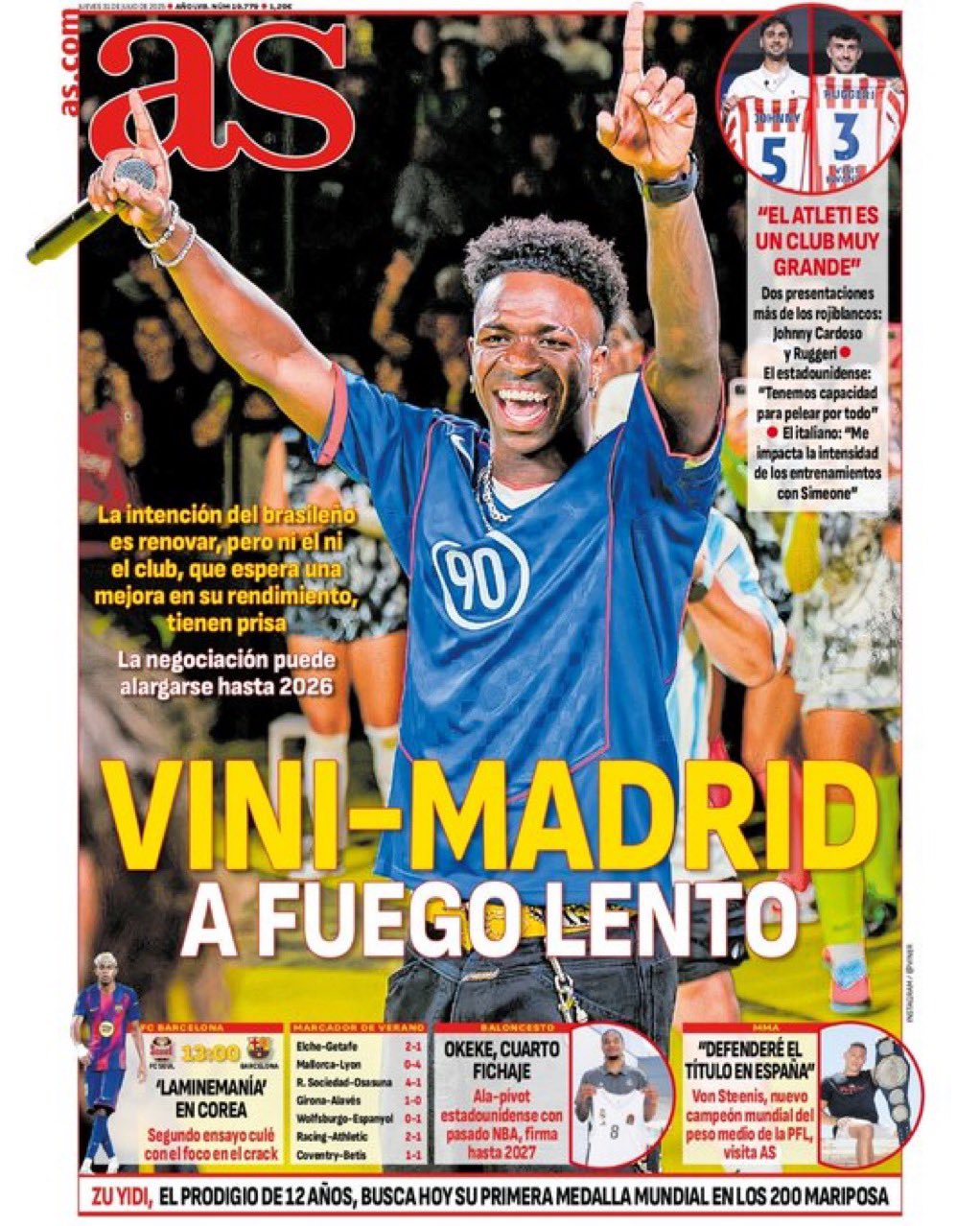 وتصدر فينيسيوس غلاف صحيفة آس الإسبانية بعنوان “فيني وريال مدريد على نار هادئة”، إلى جانب العناوين التالية: