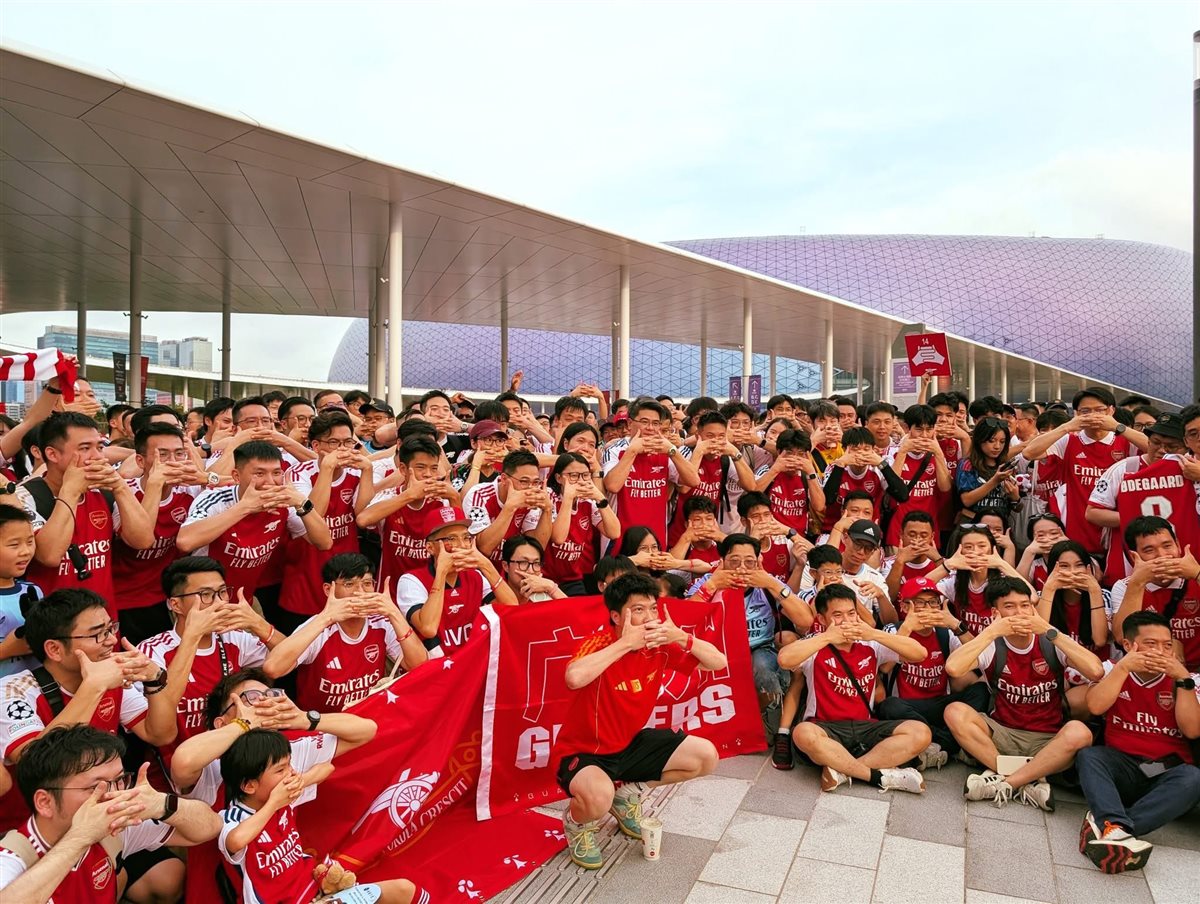 آرسنال وتوتنهام، تجمع عدد كبير من جماهير أرسنال في هونج كونج لمؤازرة فريقها أمام توتنهام الودية والتي ستقام بينهما بعد قليل في إطار تحضيرات الفريقين، قبل بداية الموسم الكروي القادم.