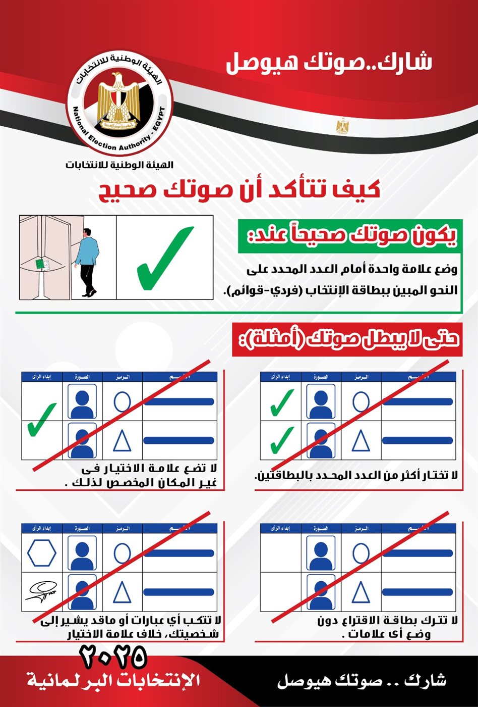 وضع علامة (✔) واحدة فقط أمام العدد المسموح به من المرشحين في كل من بطاقة "الفردي" وبطاقة "القوائم"، وفقًا لما هو موضح في بطاقات الاقتراع.
