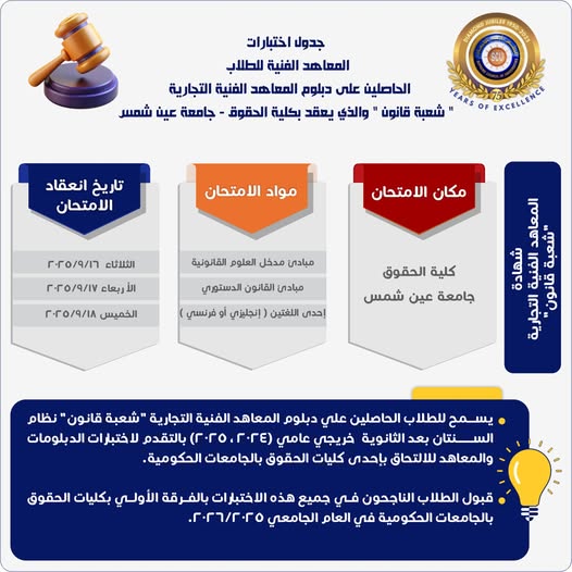 يمكن للطلاب الراغبين في أداء اختبارات المعاهد الفنية التجارية (شعبة قانون) للالتحاق بإحدى كليات الحقوق التسجيل من هنــــــــــــــــــــا.