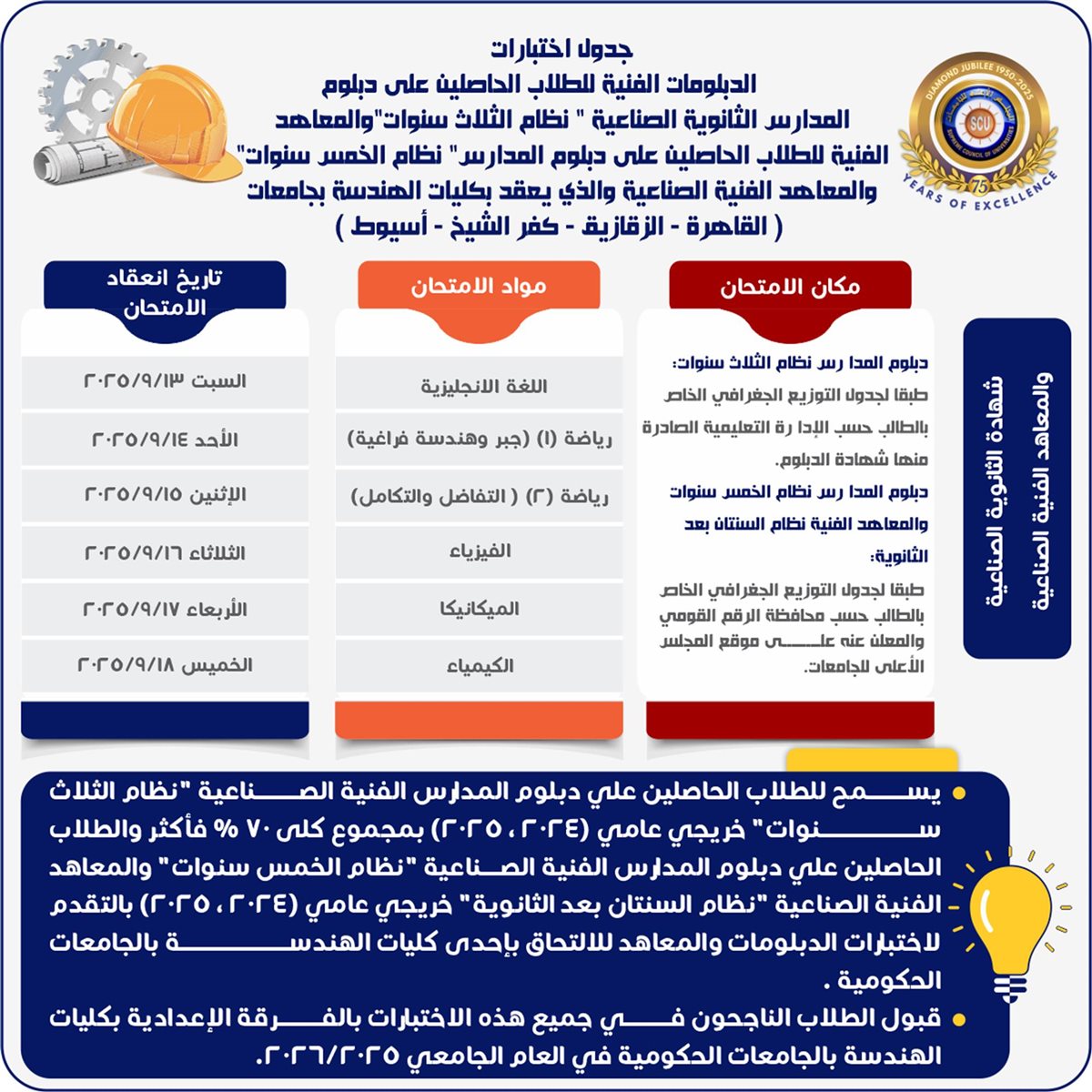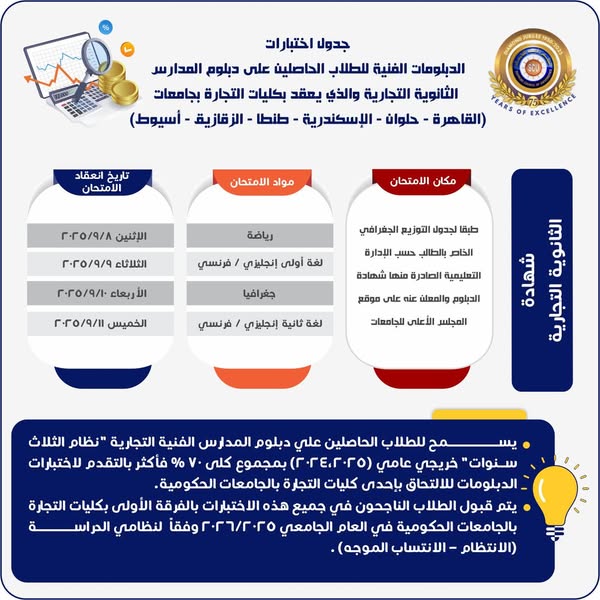 جداول اختبارات طلاب الدبلومات الفنية للالتحاق بالجامعات 2025