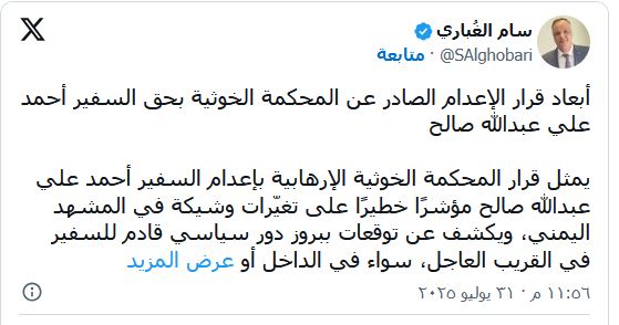وقال القيادي في حزب المؤتمر الشعبي العام -جناح الشرعية- سام الغباري، إن القرار "يُمثّل مؤشرًا خطيرًا على تغيّرات وشيكة في المشهد اليمني، ويكشف عن توقعات ببروز دور سياسي قادم للسفير في القريب العاجل، سواء في الداخل أو على مستوى التوازنات الإقليمية".