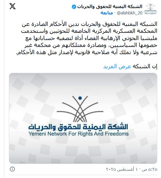 ومن جهتها أدانت "الشبكة اليمنية للحقوق والحريات" كافة الأحكام الصادرة عن المحكمة العسكرية المركزية الخاضعة للحوثيين، وتطويع الميليشيا المؤسسة القضائية، لتصفية حساباتها مع خصومها السياسيين.