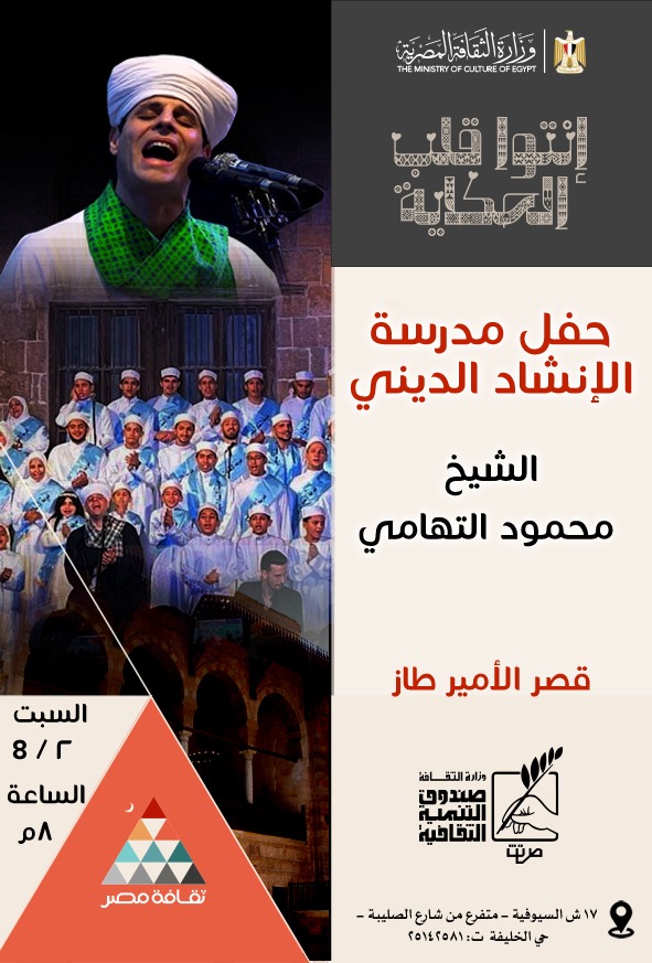 ينظم قطاع صندوق التنمية الثقافية برئاسة المعماري حمدي السطوحي، مساء غد السبت الموافق 2 أغسطس، حفلًا جديدًا لمدرسة الإنشاد الديني التابعة للصندوق، وذلك بقصر الأمير طاز بالخليفة، تحت إشراف المنشد الشيخ محمود التهامي.