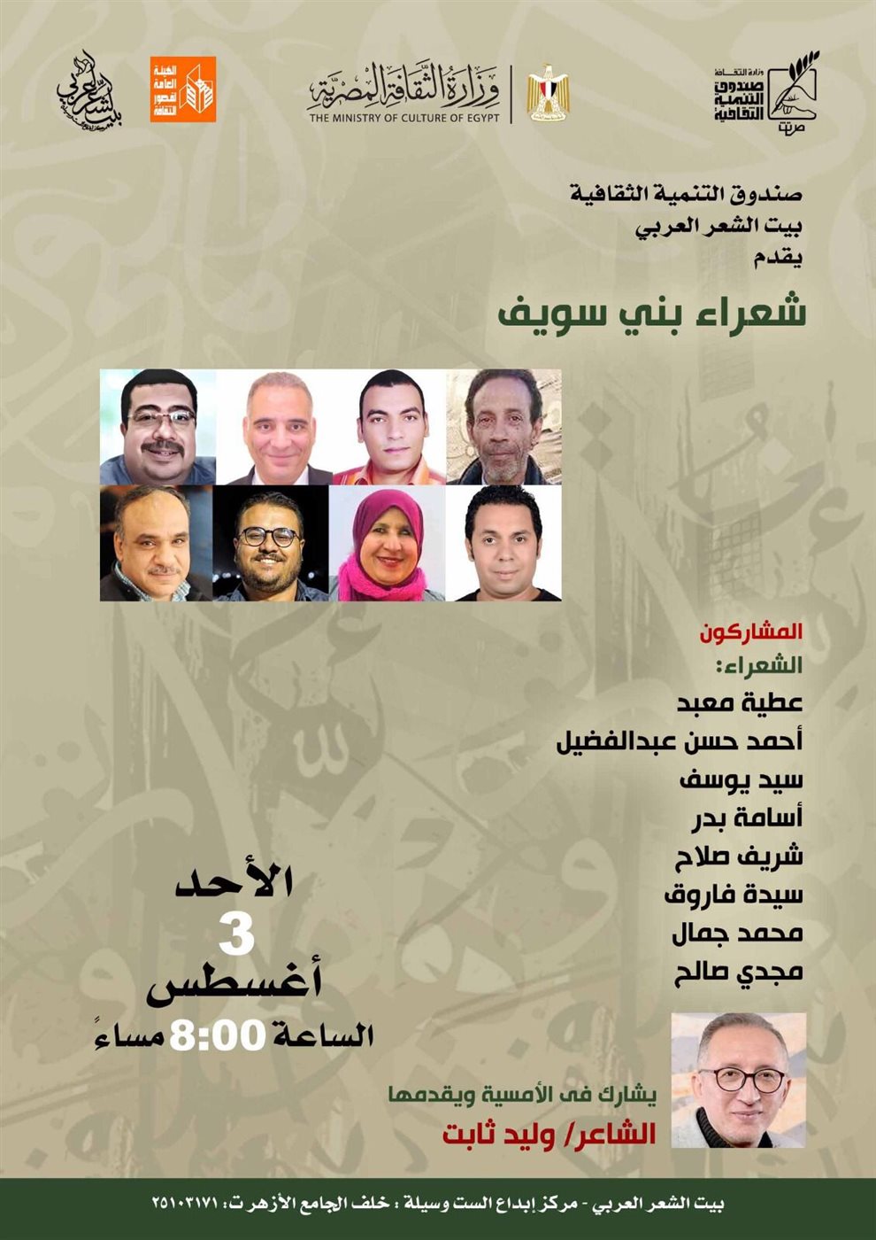 ينظم بيت الشعر العربي (بيت الست وسيلة) أمسية شعرية متميزة بعنوان "شعراء بني سويف"، وذلك في تمام الساعة الثامنة من مساء الأحد الموافق 3 أغسطس، بمقر البيت في مركز إبداع الست وسيلة، خلف الجامع الأزهر.