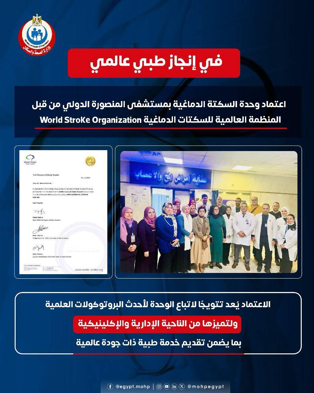 أعلنت وزارة الصحة عن إنجاز طبي عالمي جديد بمستشفى المنصورة الدولي بعد اعتماد وحدة السكتة الدماغية.