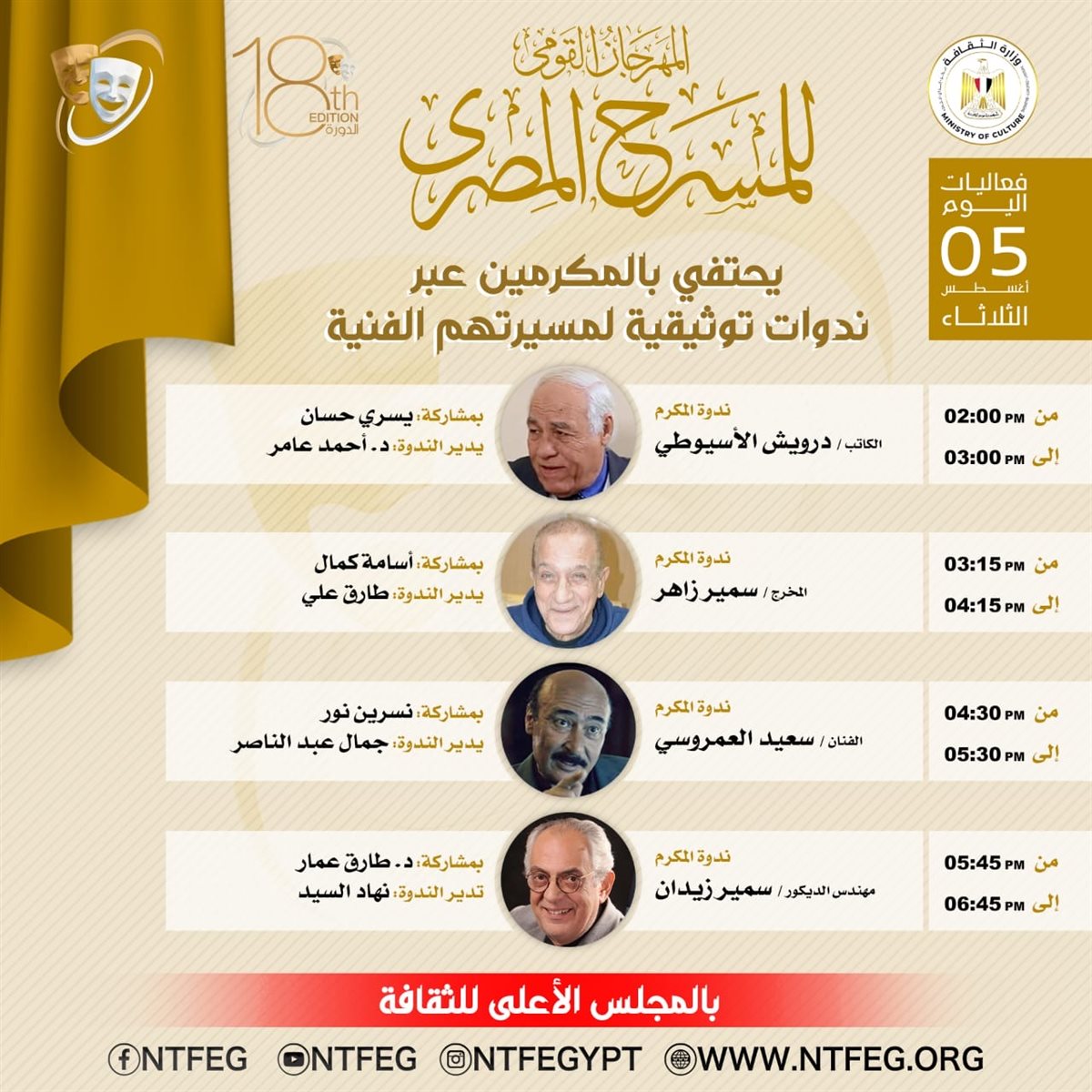 وفي الرابعة والنصف مساءً تُعقد ندوة لتكريم المسرحي سعيد العمروسي، ويديرها الكاتب والناقد جمال عبد الناصر، ويُعرض خلالها الكتاب الذي أعدته الباحثة نسرين نور، وتُختتم الندوات في الخامسة وخمس وأربعين دقيقة بندوة الفنان سمير زيدان، التي تُديرها نهاد السيد، ويُناقش فيها الكتاب الذي أعده الدكتور طارق عمار، في إطار من التوثيق الثقافي والتقدير لمسيرة رواد المسرح في الأقاليم.