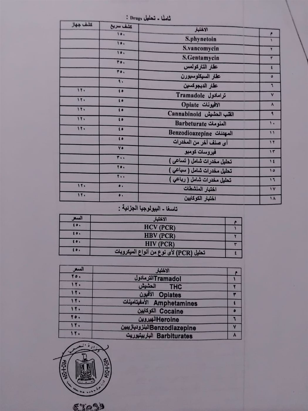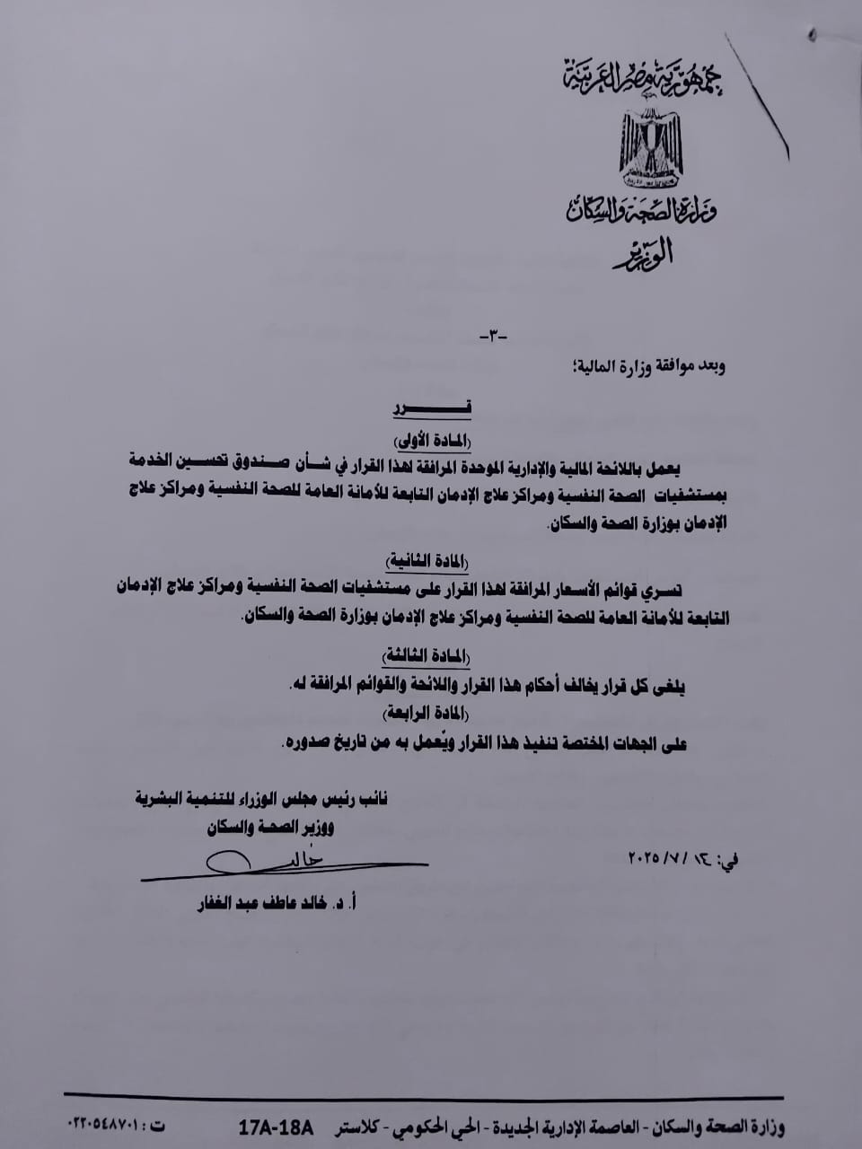ونص القرار الوزاري على قوائم أسعار للخدمات العلاجية التي تقدمها مستشفيات الصحة النفسية وعلاج الإدمان.