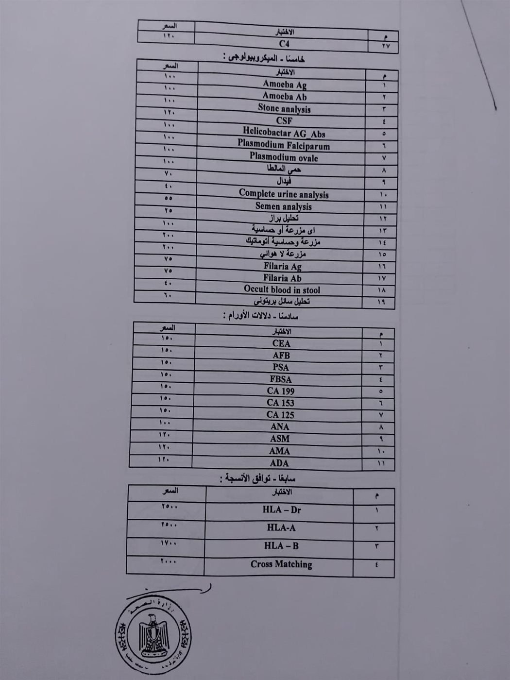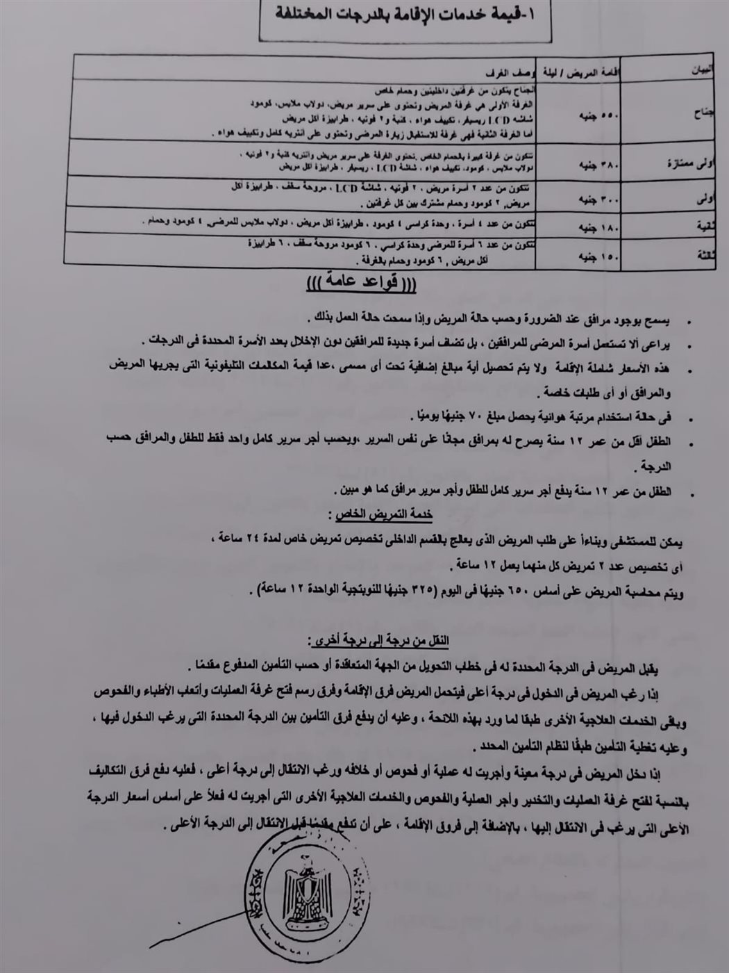 وتضمنت قوائم الأسعار تكلفة الإقامة فقط للمريض لليوم الواحد بدء من ١٥٠ جنيها للدرجة الثالثة و١٨٠ جنيها للثانية و٣٠٠ جنيه للأولى و٣٨٠ جنيها للأولى الممتازة، بينما كانت الإقامة بالجناح تكلفتها ٥٥٠ جنيها يوميا، ذلك بخلاف تكاليف الخدمات العلاجية من أدوية وفحوصات طبية منها التحاليل الروتينية، حيث تخطت تكاليف وظائف الكلي والكبد والسكر وصورة الدم ٤٠٠ جنيه، فضلًا عن جلسات العلاج الكهربائي التي وصل سعر الجلسة الواحدة ٤٠٠ جنيه.