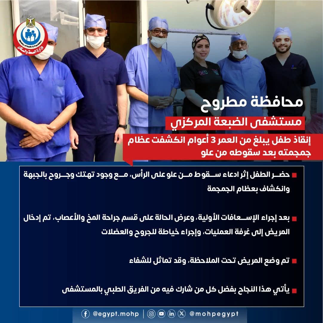 الصحة: إنقاذ حياة طفل تعرض لتهتك وانكشاف لعظام الجمجمة بـ الضبعة المركزي