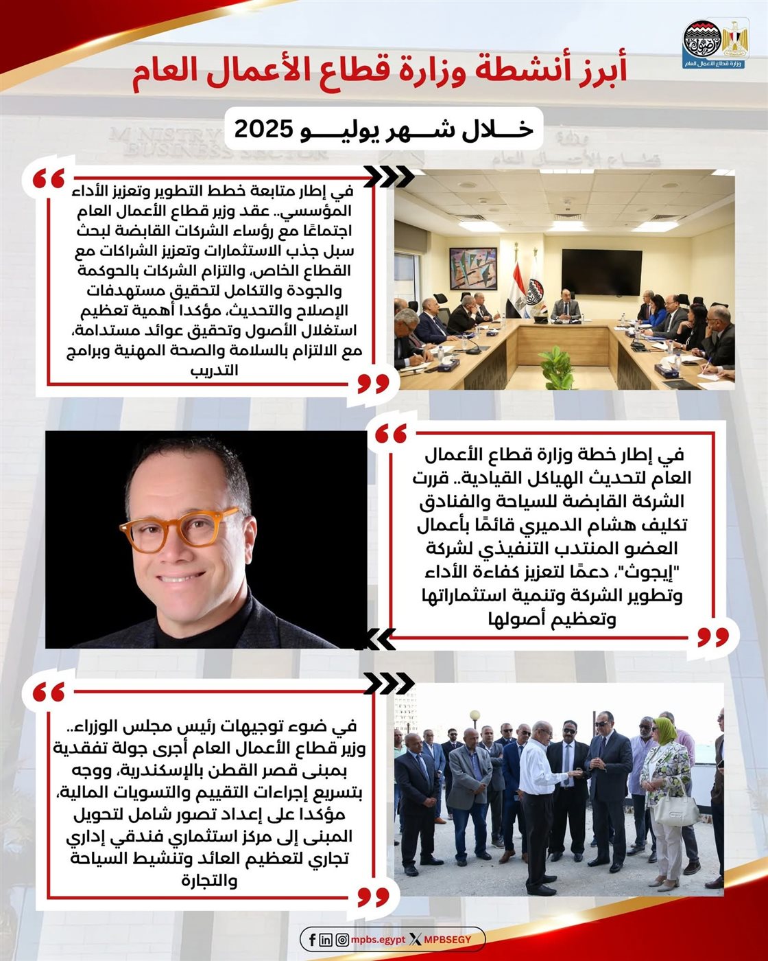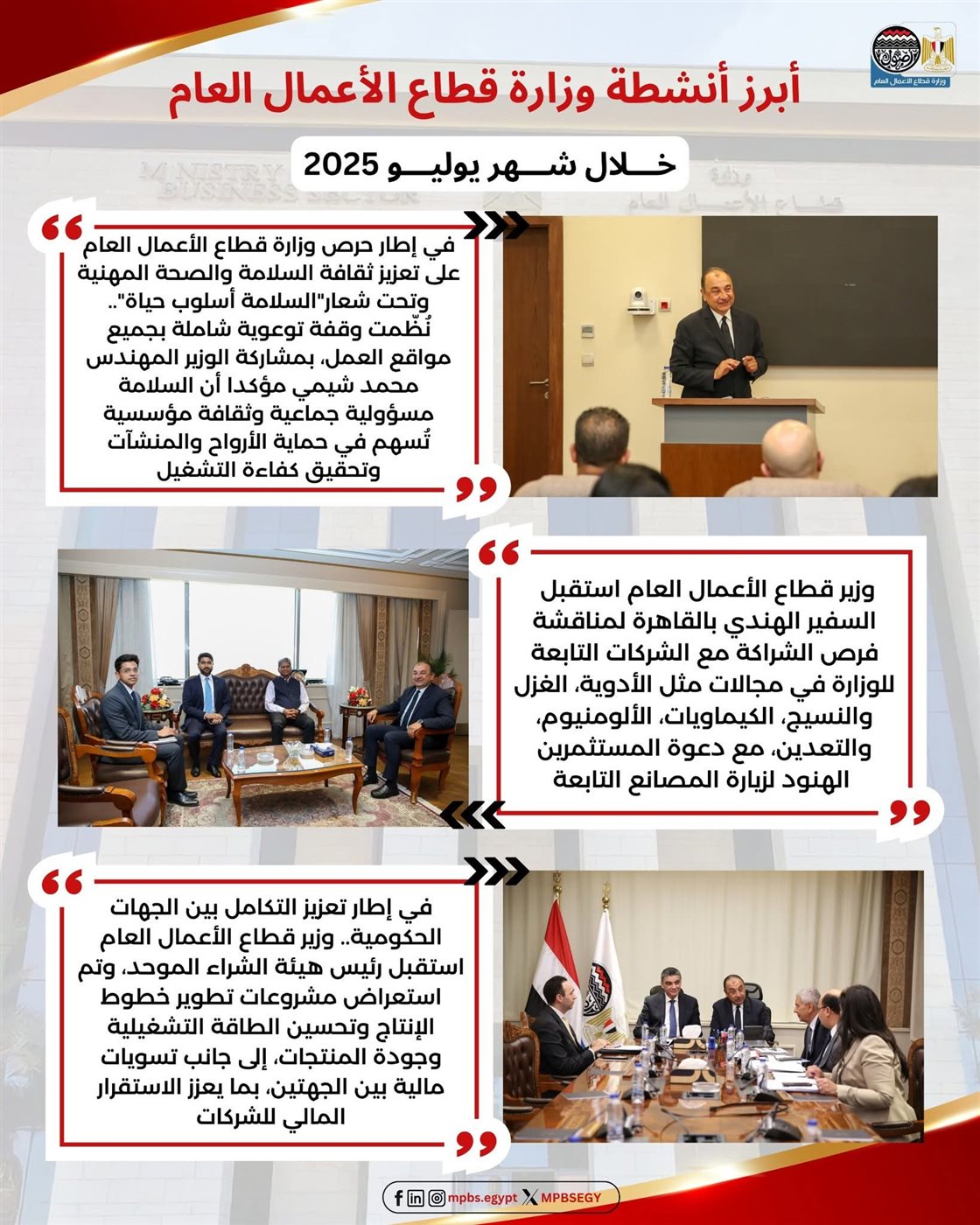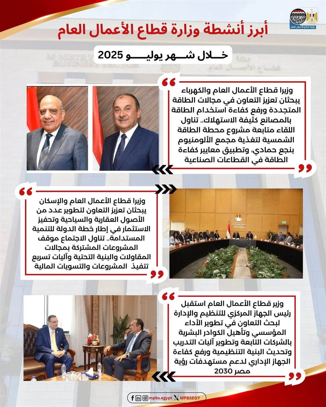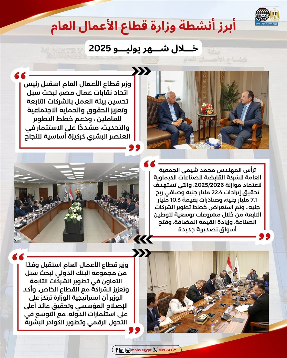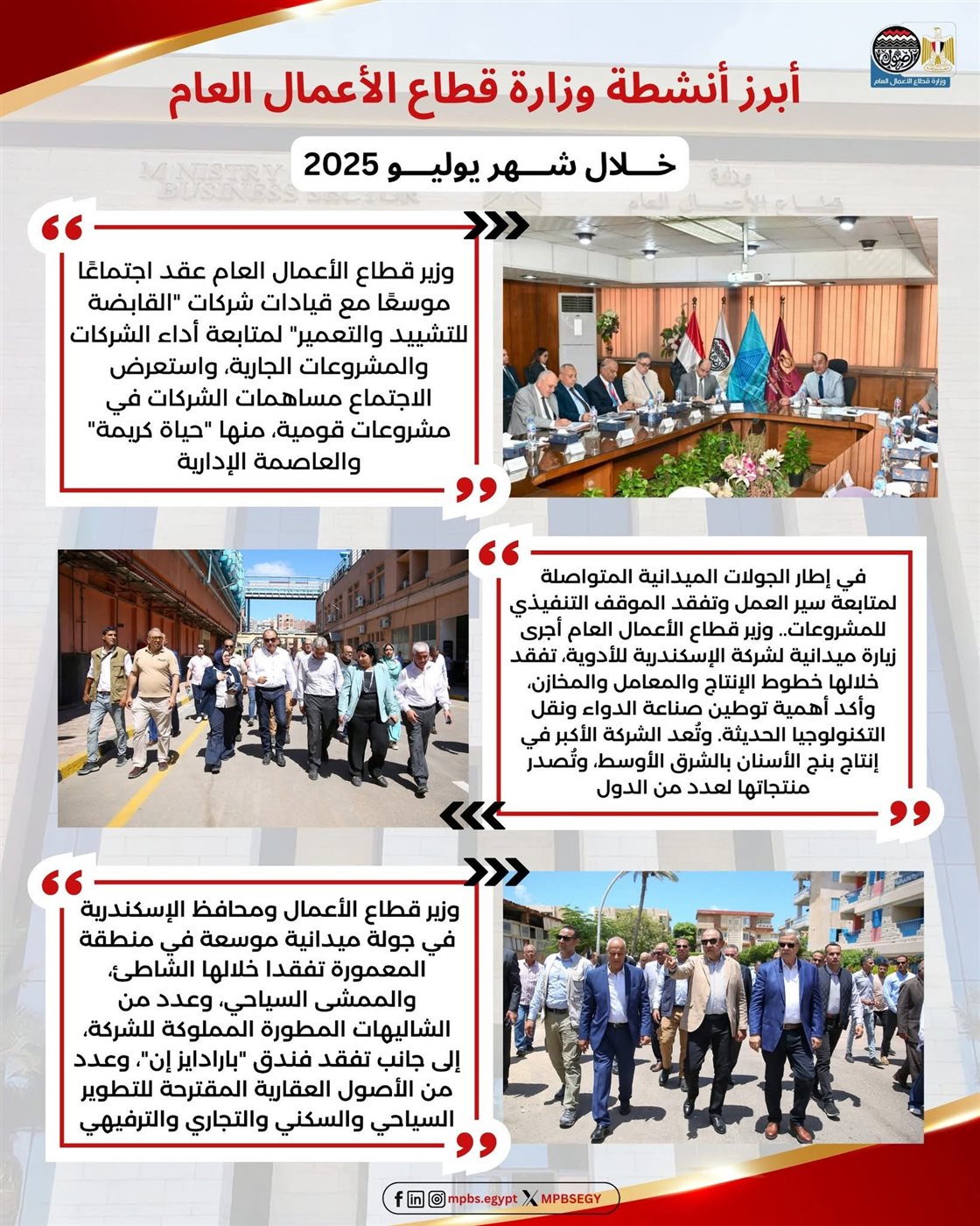 نشرت الصفحة الرسمية لوزارة قطاع الأعمال العام انفوجراف عن النشاط المكثف لوزارة قطاع الأعمال العام خلال شهر يوليو 2025.