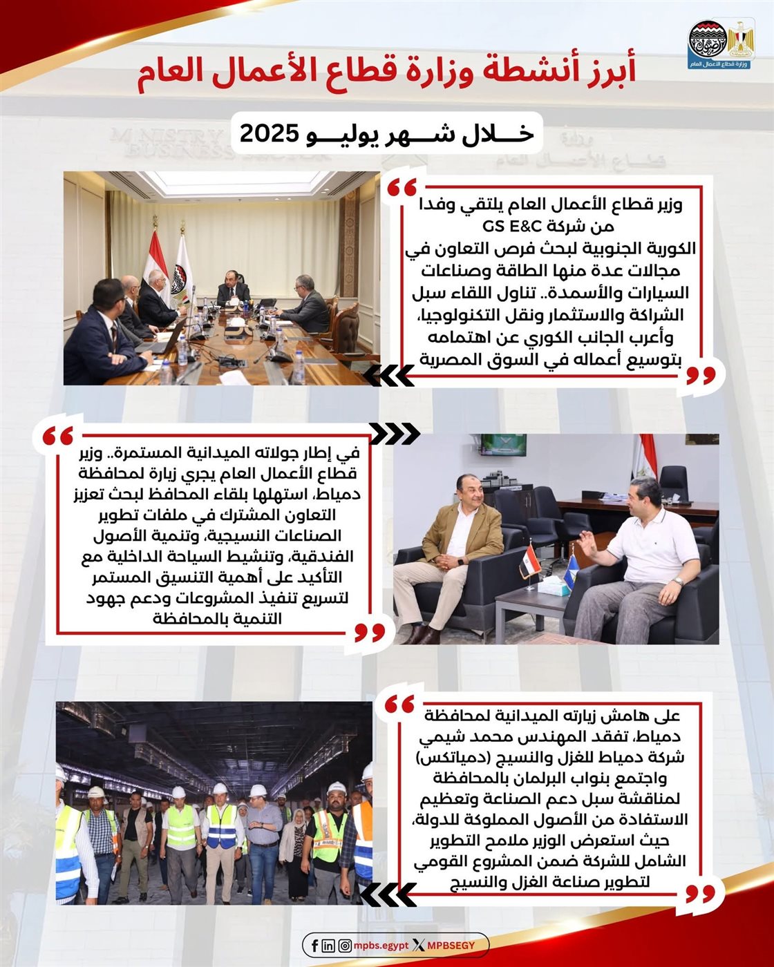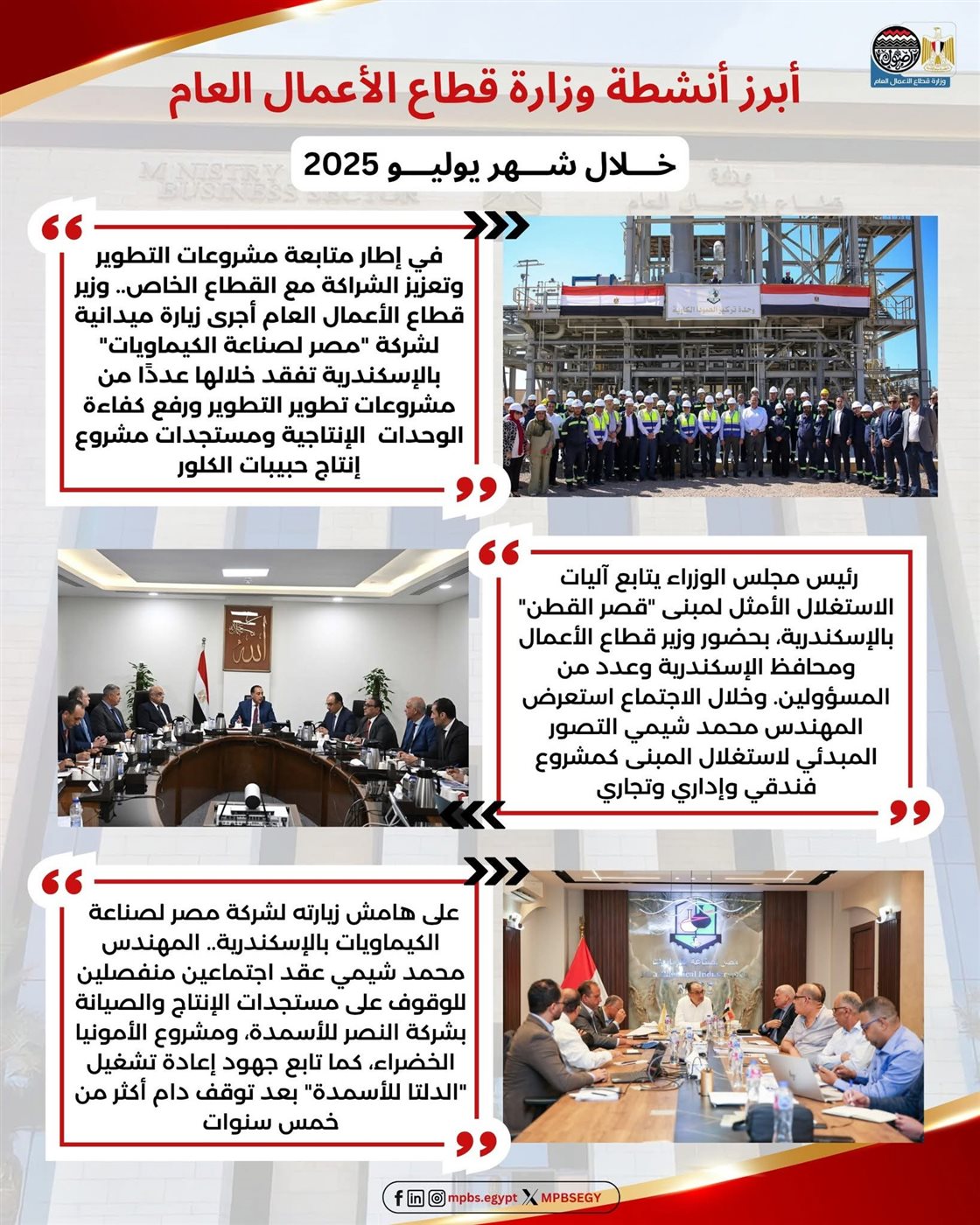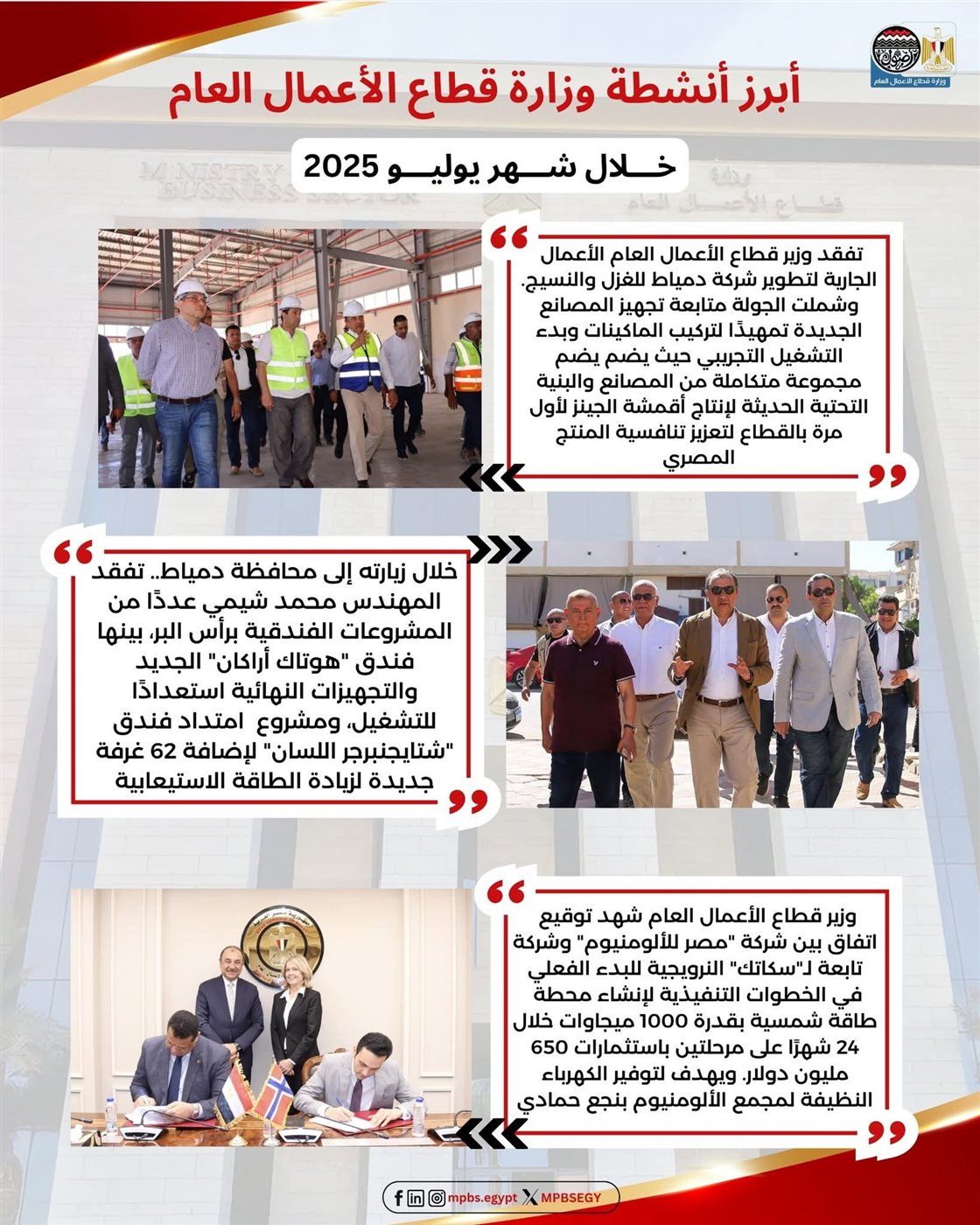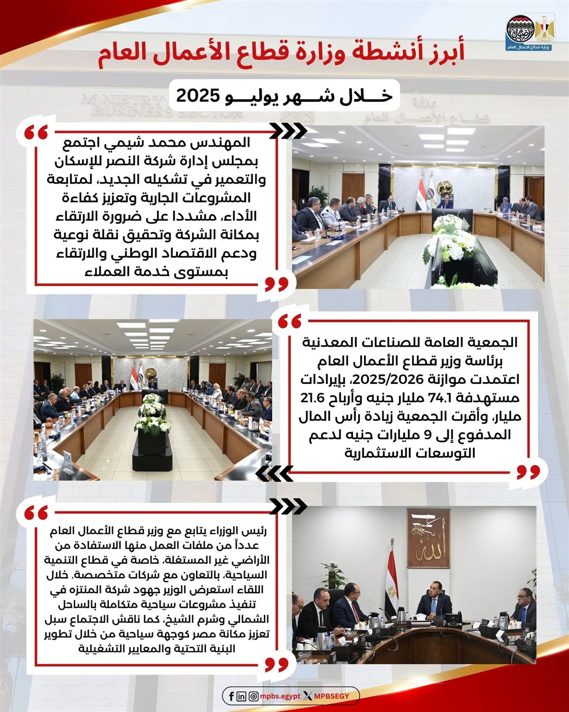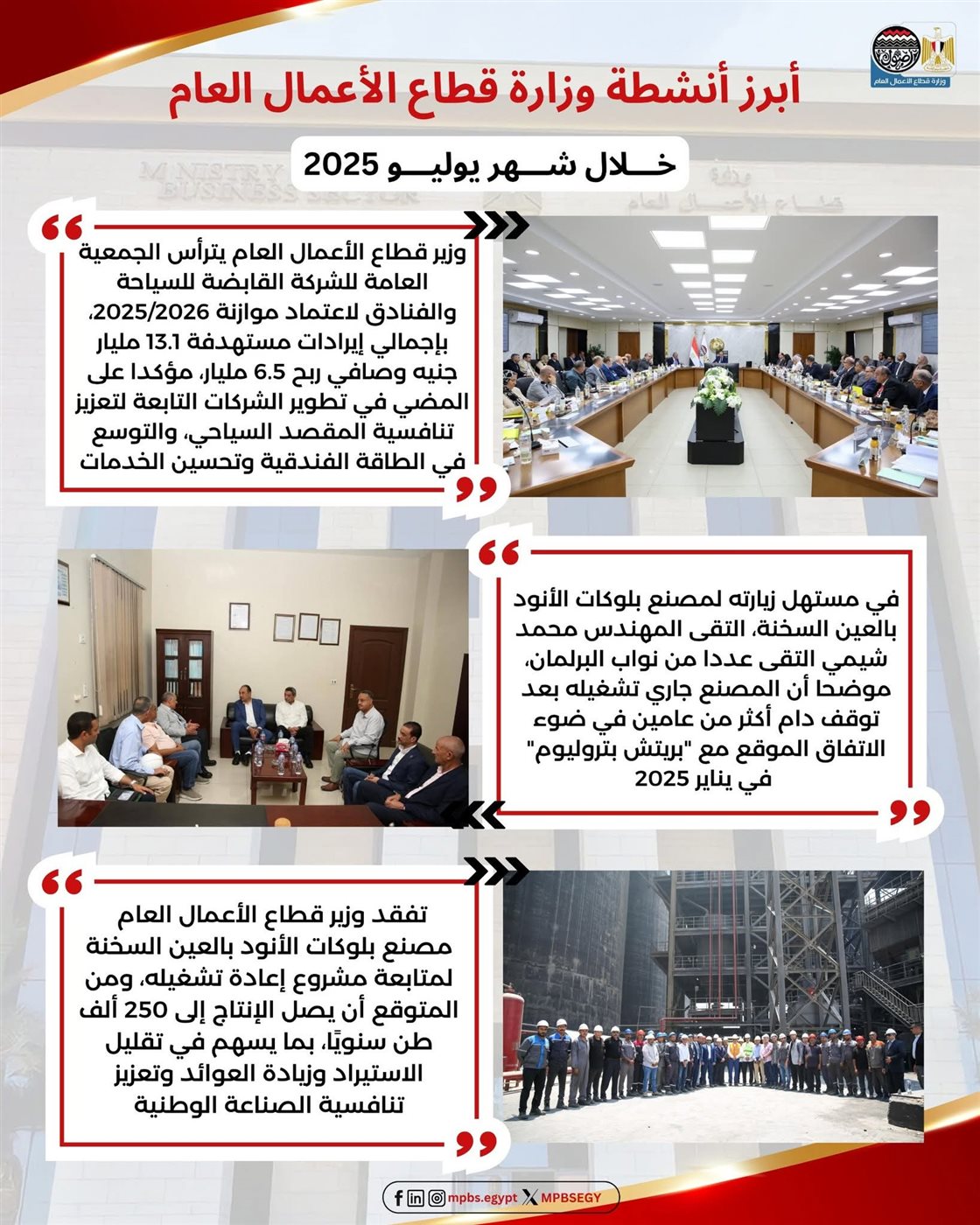 نشرت الصفحة الرسمية لوزارة قطاع الأعمال العام انفوجراف عن النشاط المكثف لوزارة قطاع الأعمال العام خلال شهر يوليو 2025.