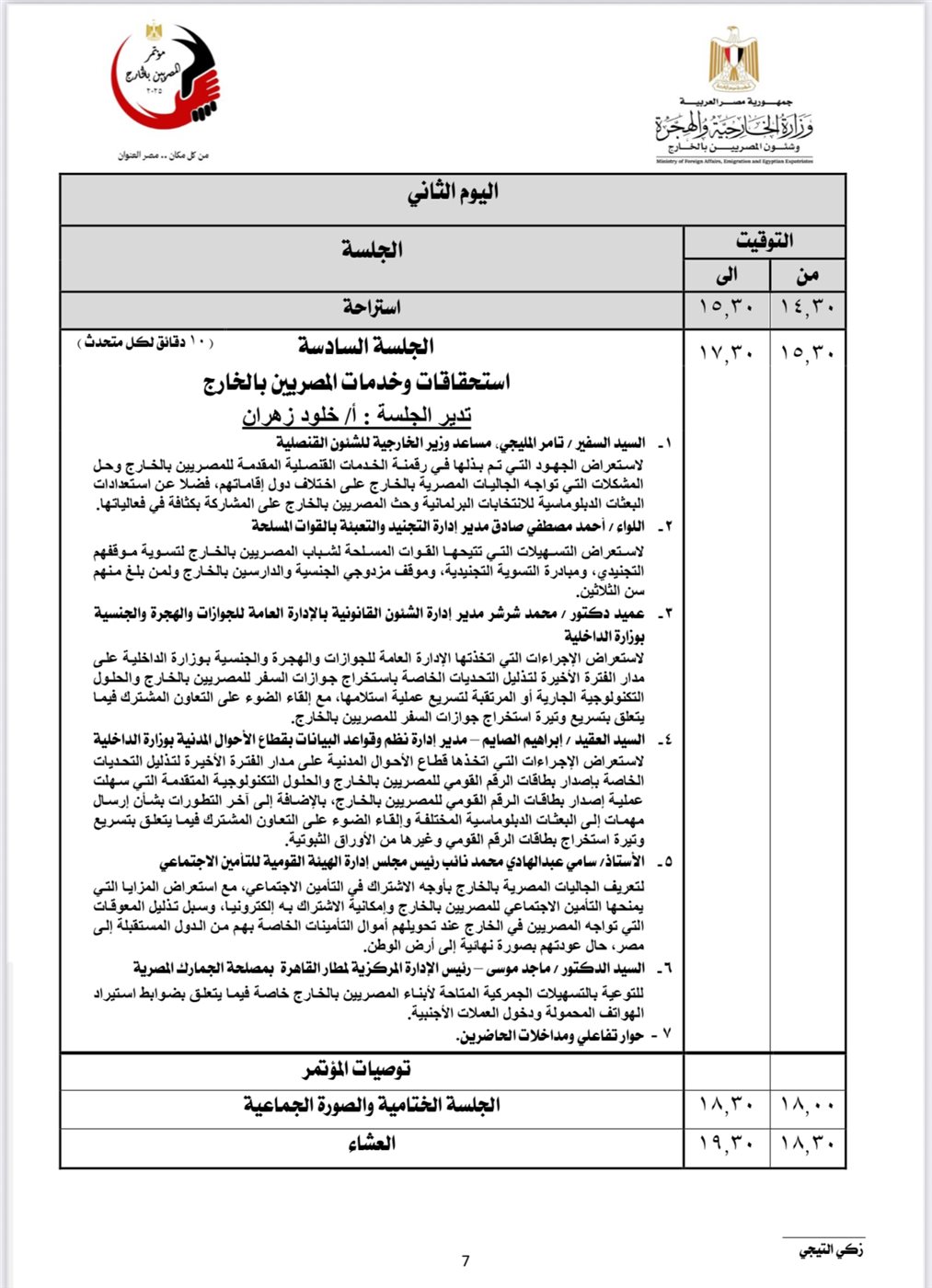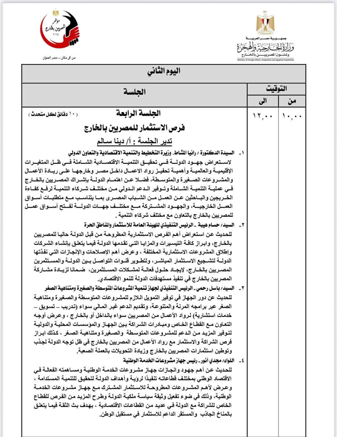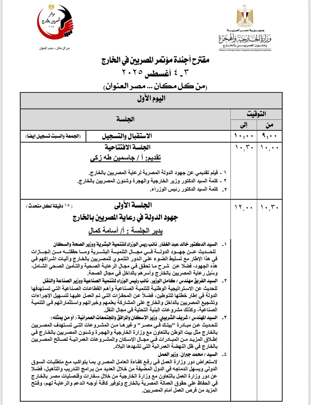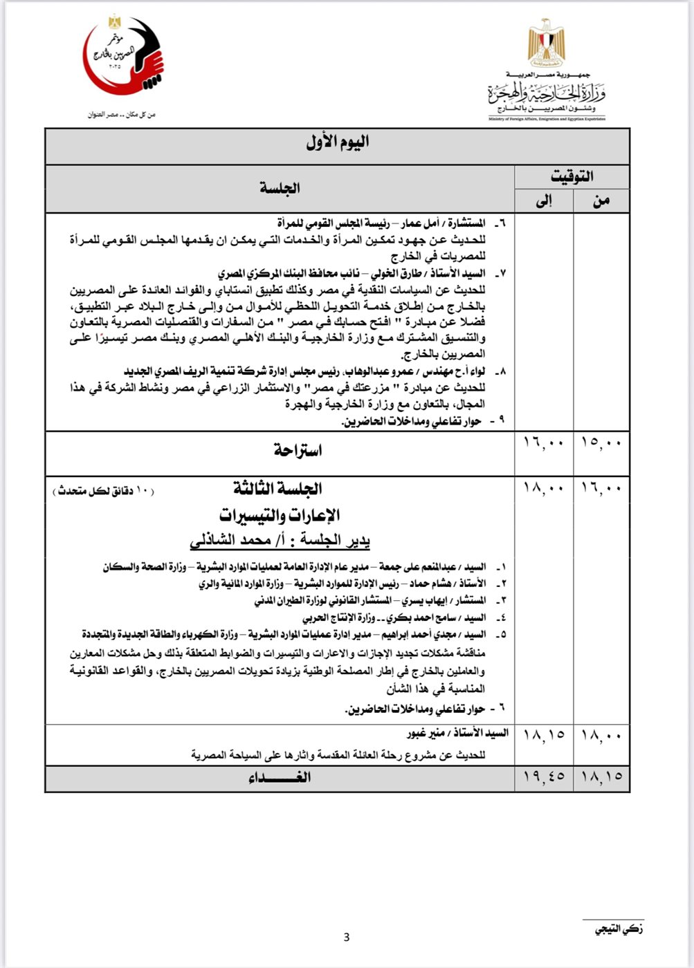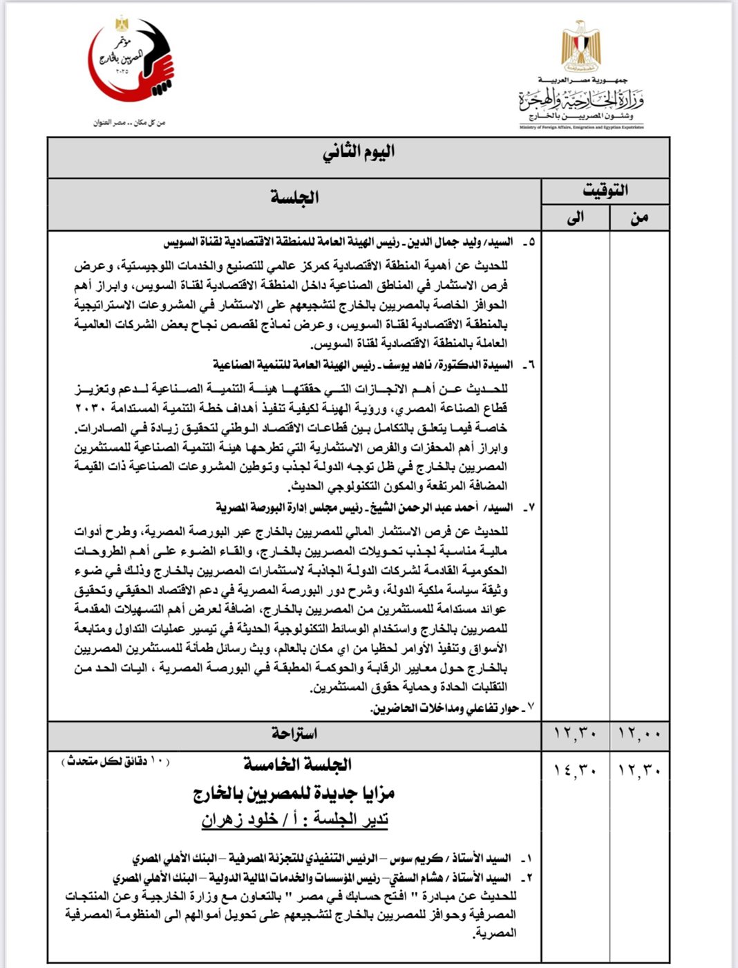 وتستمر فعاليات المؤتمر يومي 3 و4 أغسطس 2025 بحضور الدكتور مصطفى مدبولي رئيس مجلس الوزراء، بمشاركة عدد من الوزراء والمؤسسات الحكومية وغير الحكومية وبحضور ممثلي الجاليات المصرية بالخارج من كل أنحاء العالم.