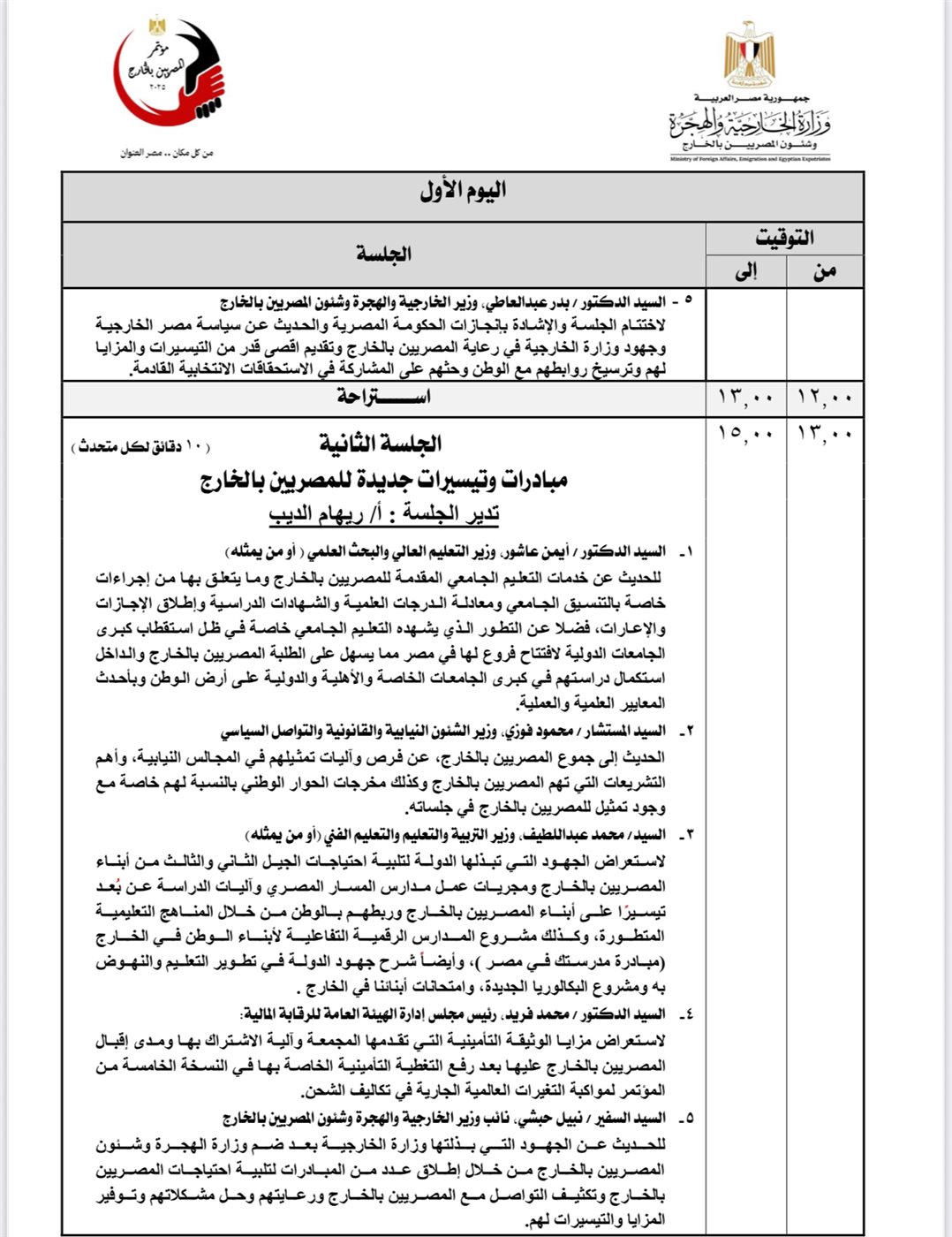 وتشهد الجلسة الإفتتاحية فيلما تقديميا عن جهود الدولة المصرية في رعاية المصريين بالخارج يعقبها كلمة وزير الخارجية الدكتور بدر عبد العاطي وكلمة الدكتور مصطفى مدبولي رئيس مجلس الوزراء.