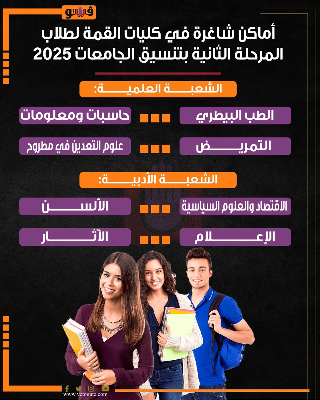 أماكن شاغرة في كليات القمة لطلاب المرحلة الثانية بتنسيق الجامعات 2025 (إنفوجراف)