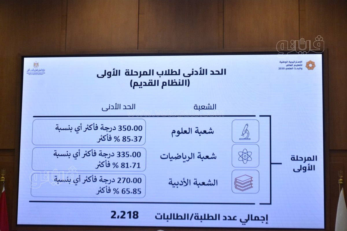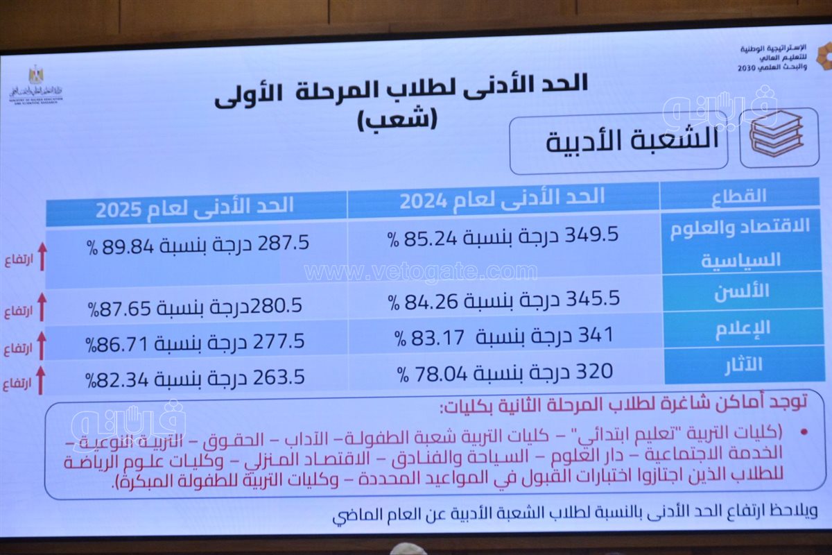 وأشار غانم إلى تنسيق الشعبة الأدبية في المرحلة الأولى هذا العام، شهد مفاجأة، بسبب وجود طفرة كبيرة في إعداد المجاميع التكرارية للطلاب، عن الأعوام السابقة، لافتا إلى ان الحد الأدنى للقبول في المرحلة الأولى هذا العام، جاء أعلى بحوالي ٤.٥% عن العام الماضي وهذا أعطى مؤشرا لوجود زيادة في الحد الأدنى لكليات القمة في الشعبة الأدبية، وهي الاقتصاد والعلوم السياسية والألسن والآثار والإعلام بحوالي من ٣ إلى ٤%. وتم استنفاذ كافة الأماكن بهذه الكليات في المرحلة الأولى.