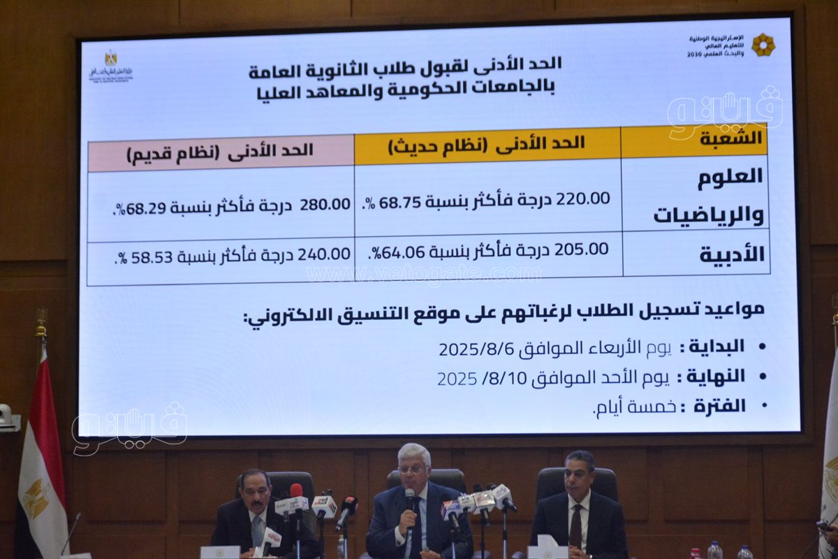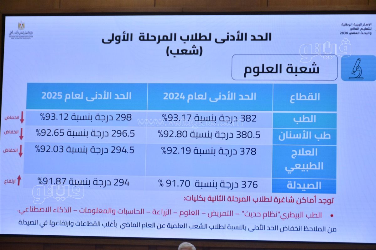 وأضاف خلال تصريحات خاصة لـ “فيتو” على هامش المؤتمر الصحفي للإعلان عن نتيجة المرحلة الأولى للتنسيق، أنه بالنسبة لشعبة علمي رياضة كان الحد الأدنى للقبول بها أعلى بنسبة ١% عن العام الماضي، وهذا بسبب ارتفاع نسبة المجاميع التكرارية في شعبة علمي علوم.