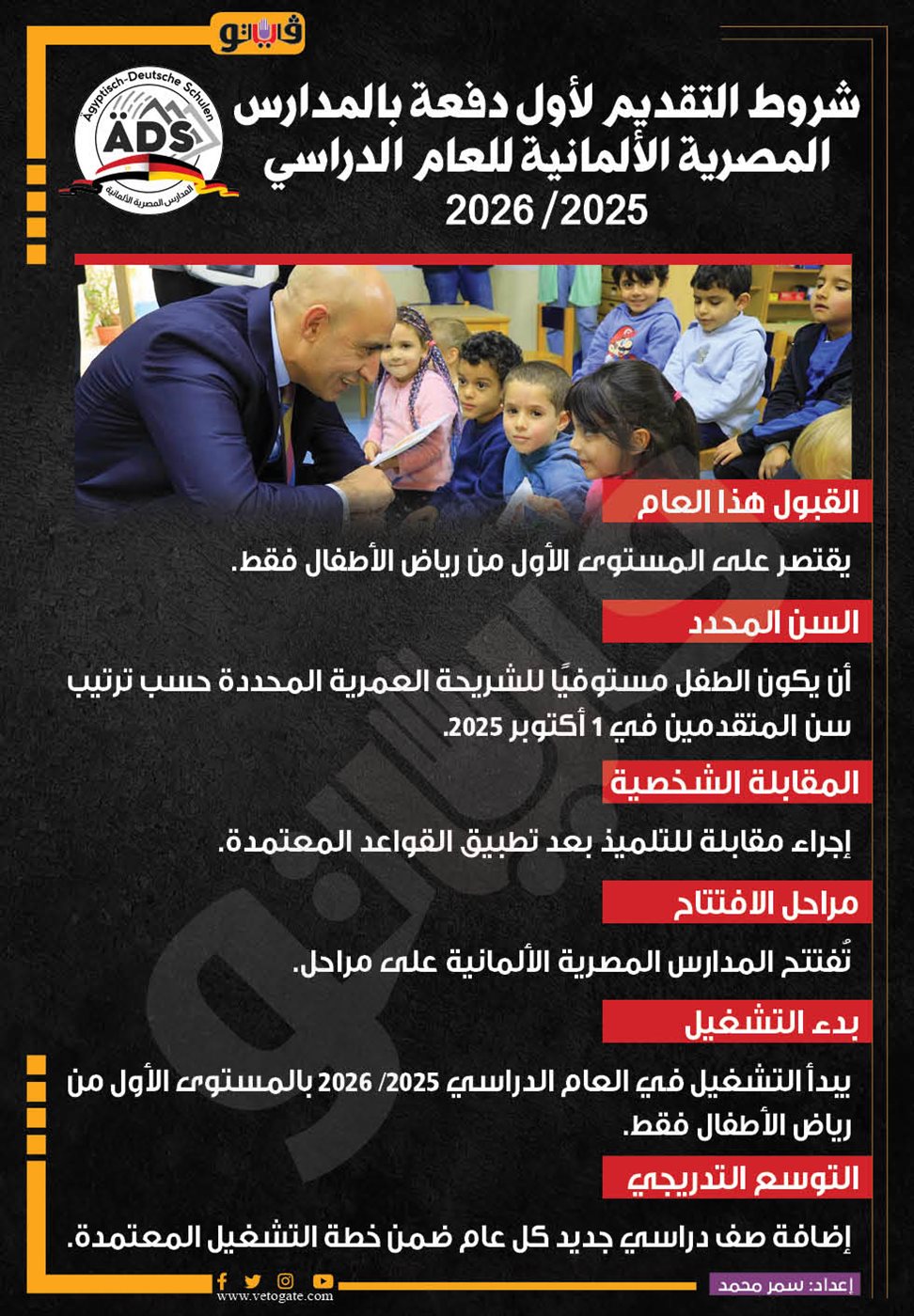 شروط التقديم لأول دفعة بالمدارس المصرية الألمانية للعام الدراسي 2025/ 2026 (إنفوجراف)