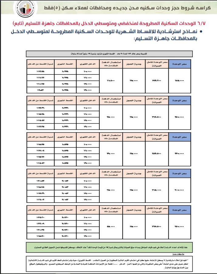 الاقساط الاسترشادية لشقق أصحاب الأولوية سكن لكل المصريين 5 لمتوسطي الدخل