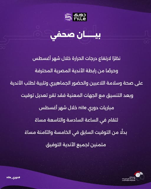 وأعلنت رابطة الأندية المصرية في بيان رسمي أنه: "نظرا لارتفاع درجات الحرارة خلال شهر أغسطس، وحرصًا من رابطة الأندية المصرية المحترفة على صحة وسلامة اللاعبين والحضور الجماهيري وتلبية لطلب الأندية، وبعد التنسيق مع الجهات المعنية فقد تقرر تعديل توقيت مباريات دوري نايل خلال شهر أغسطس، لتقام في الساعة السادسة والتاسعة مساءً، بدلا من التوقيت السابق في الخامسة والثامنة مساءً، متمنين لجميع الأندية التوفيق".