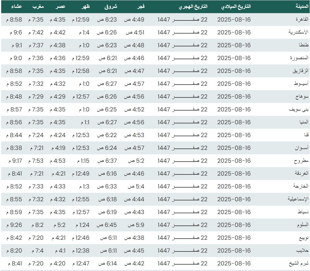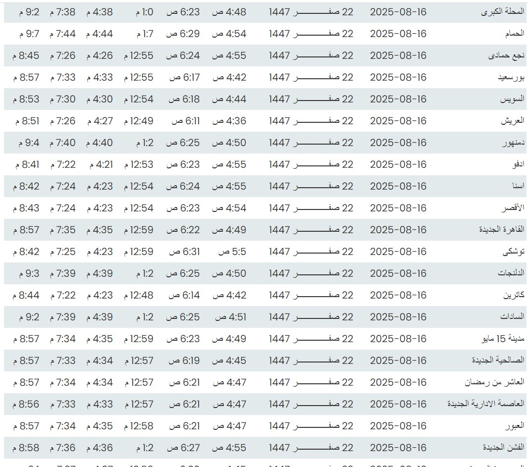 وفيما يلي مواقيت الصلاة، لعدد من مدن ومحافظات الجمهورية من واقع بيانات الهيئة العامة للمساحة