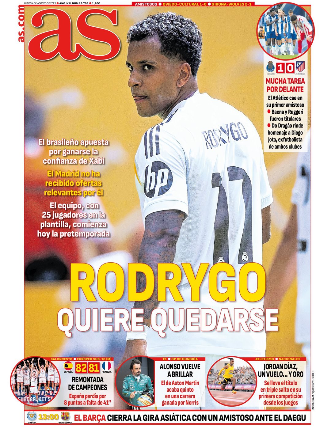 تصدر البرازيلي رودريجو لاعب نادي ريال مدريد، غلاف صحيفة آس الإسبانية في ظل التكهنات المحيطة بمستقبله قبل انطلاق موسم 2025-2026.