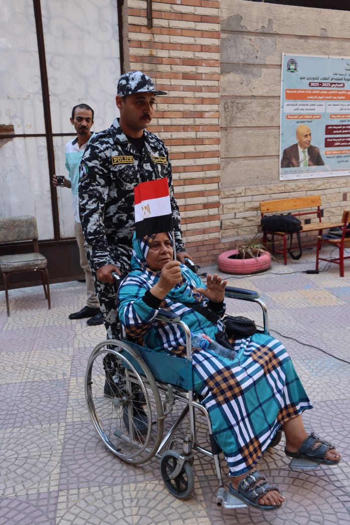 ورفع الناخبون الأعلام المصرية مع ترديد هتافات “تحيا مصر”" مصر مصر "، بينما تواجد رجال الأمن أمام بوابات اللجان لتأمين دخول الناخبين وكبار السن وذوي الهمم.