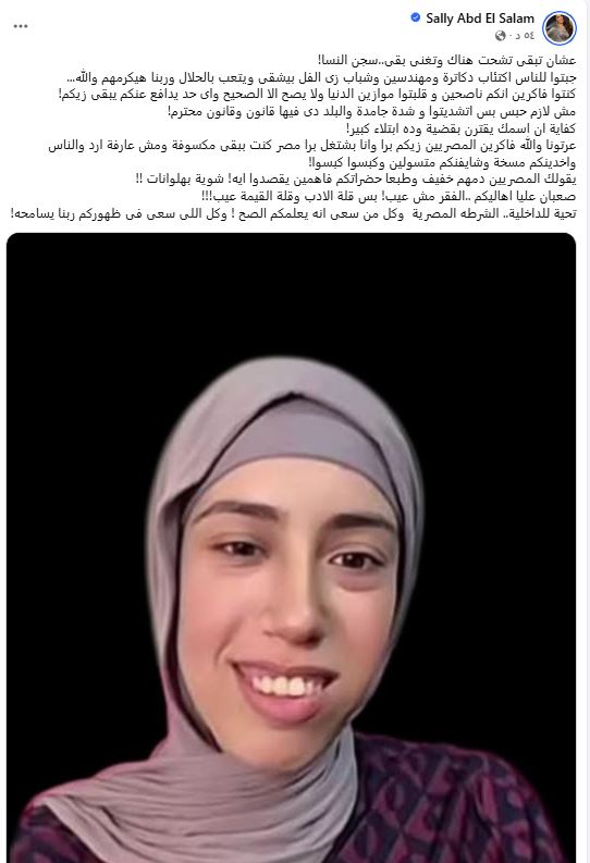 وكتبت الإعلامية سالي عبد السلام على صفحتها بـ"فيس بوك" منشورًا تحت عنوان: “عشان تبقى تشحت هناك وتغني بقى..سجن النسا!” مصحوبًا بصورة البلوجر علياء قمرون.