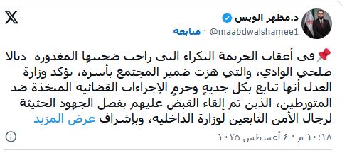 ومن جانبه تفاعل وزير العدل السوري مظهر الويس، مع جريمة قتل الفنانة خنقًا بمنزلها في ديالا صلحي الوادي داخل منزلها في حي المالكي بالعاصمة دمشق.