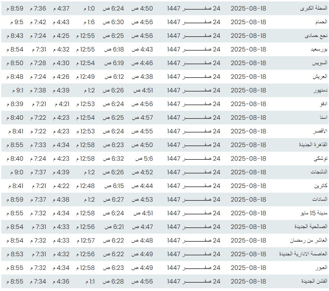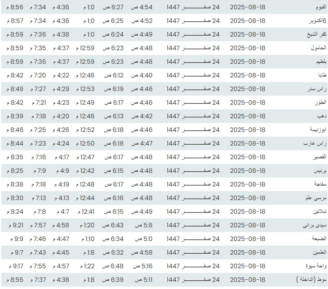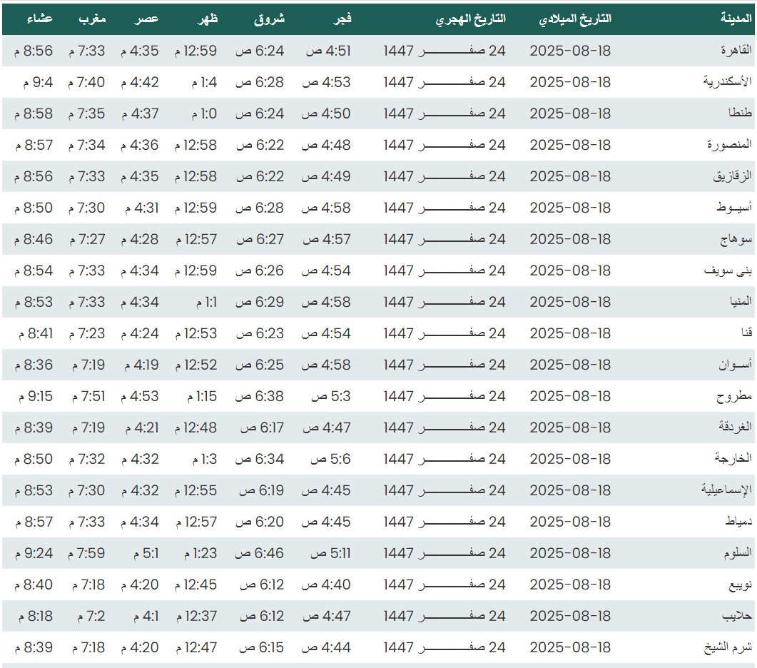 وفيما يلي مواقيت الصلاة، لعدد من مدن ومحافظات الجمهورية من واقع بيانات الهيئة العامة للمساحة