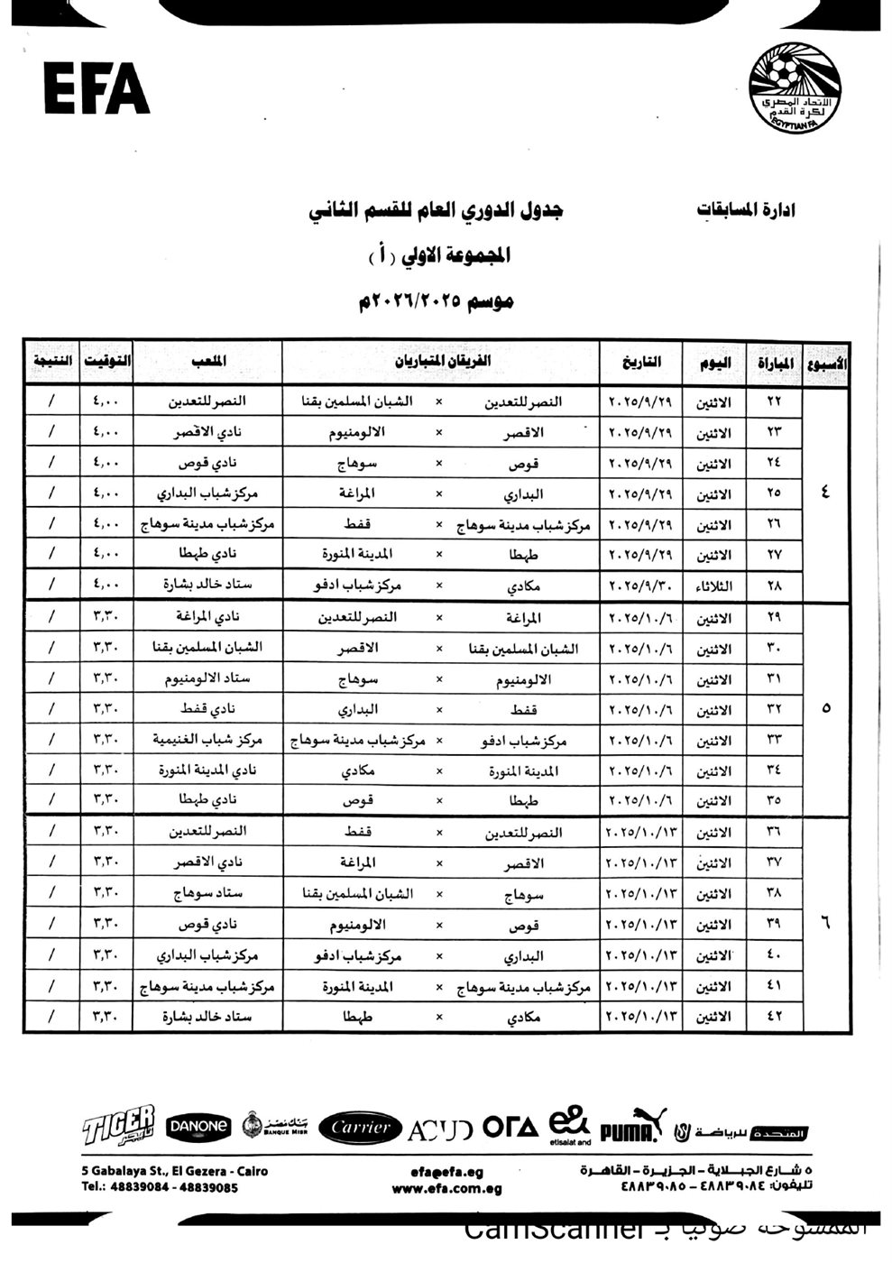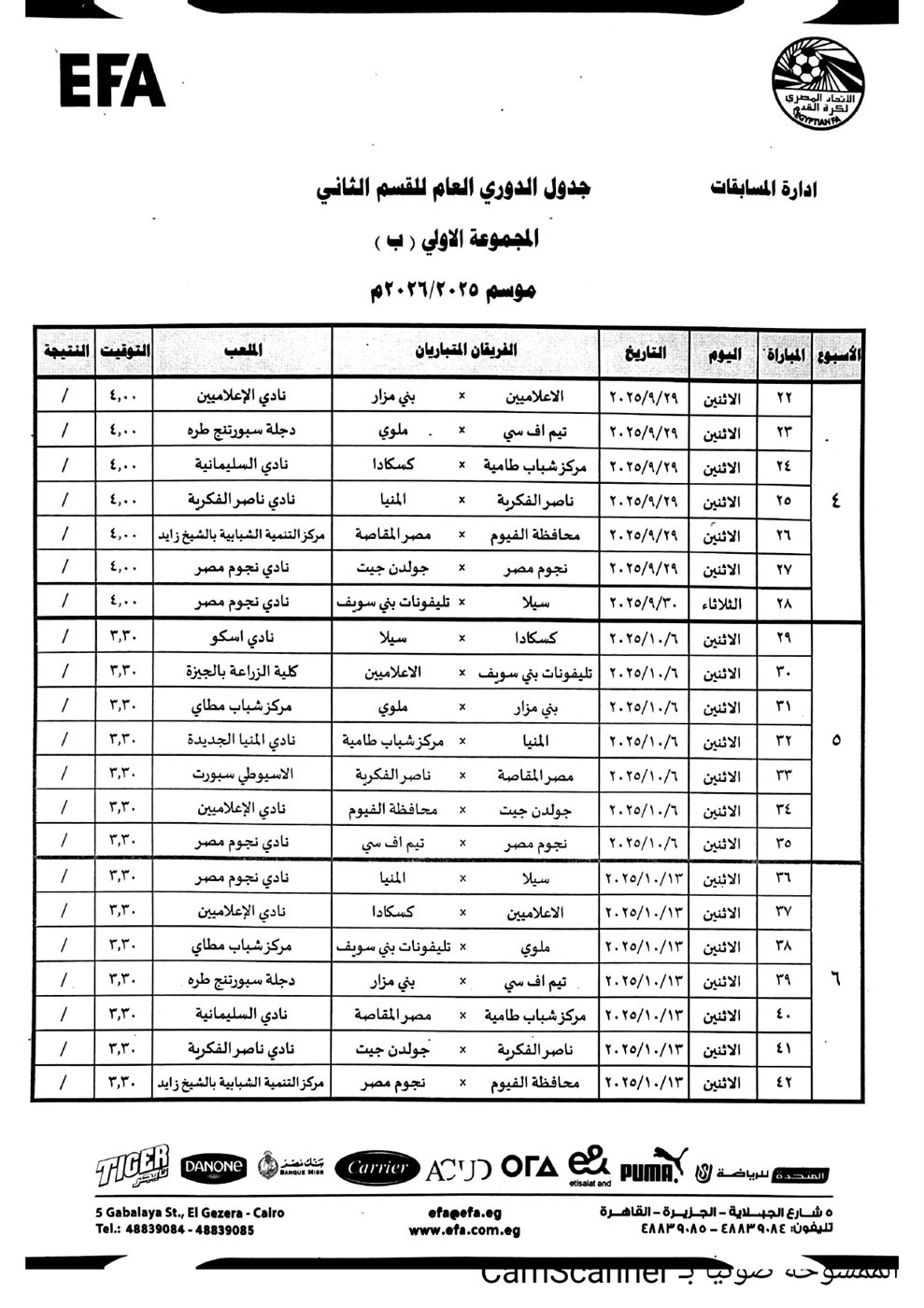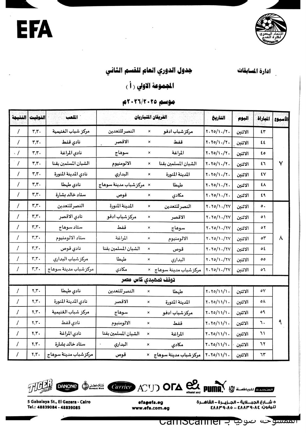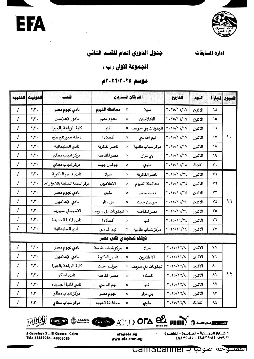 كشف اتحاد الكرة، جدول مباريات المجموعة الأولى لمسابقة دوري القسم الثاني ب للمجموعة الأولى أ وب مجموعتي الصعيد موسم 2025-2026.