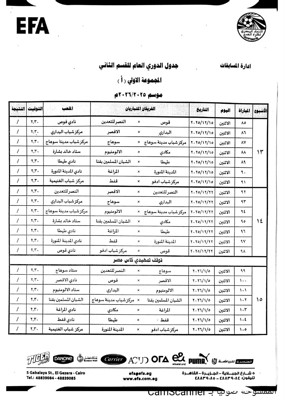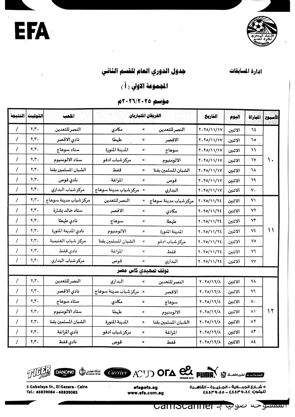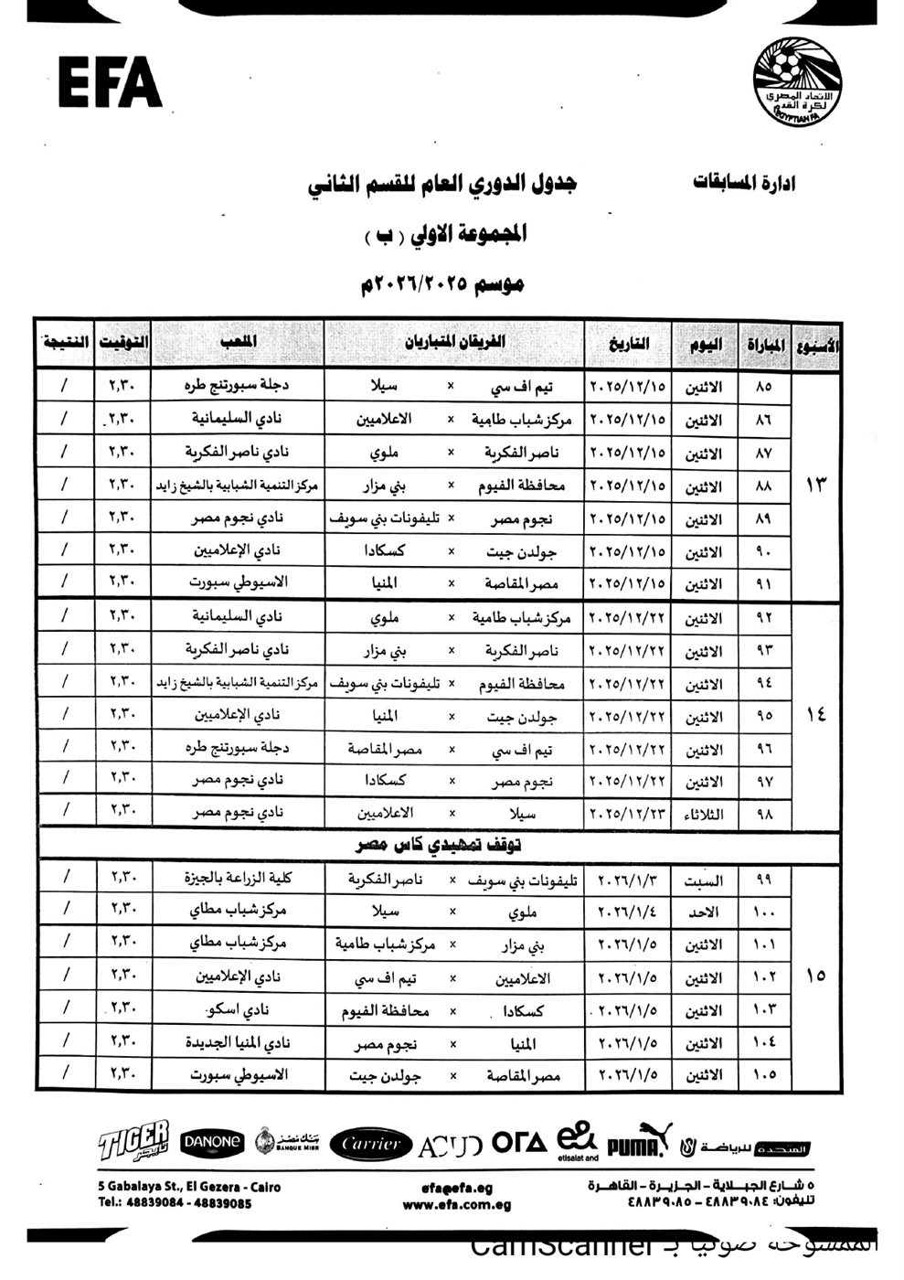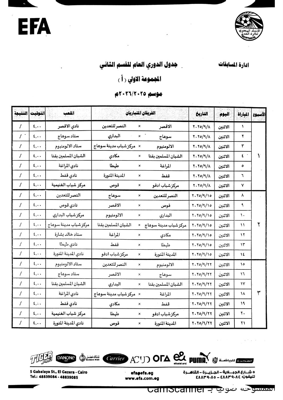 كشف اتحاد الكرة، جدول مباريات المجموعة الأولى لمسابقة دوري القسم الثاني ب للمجموعة الأولى أ وب مجموعتي الصعيد موسم 2025-2026.