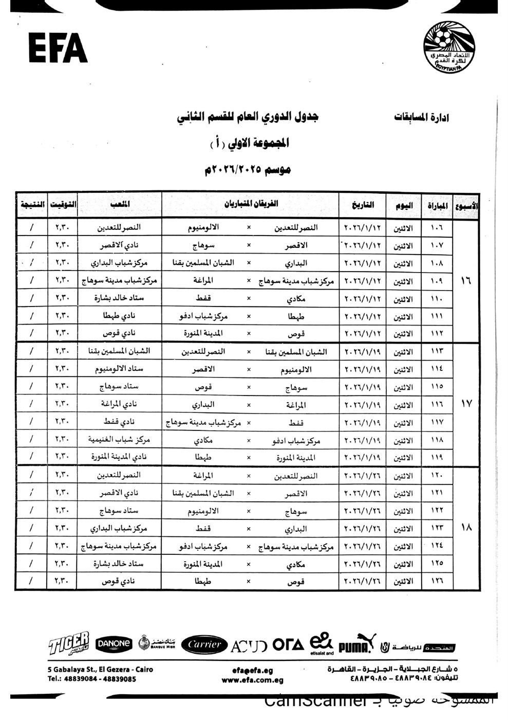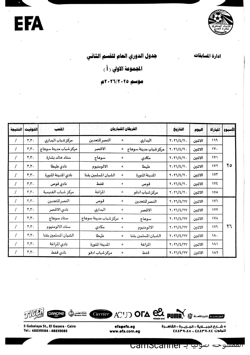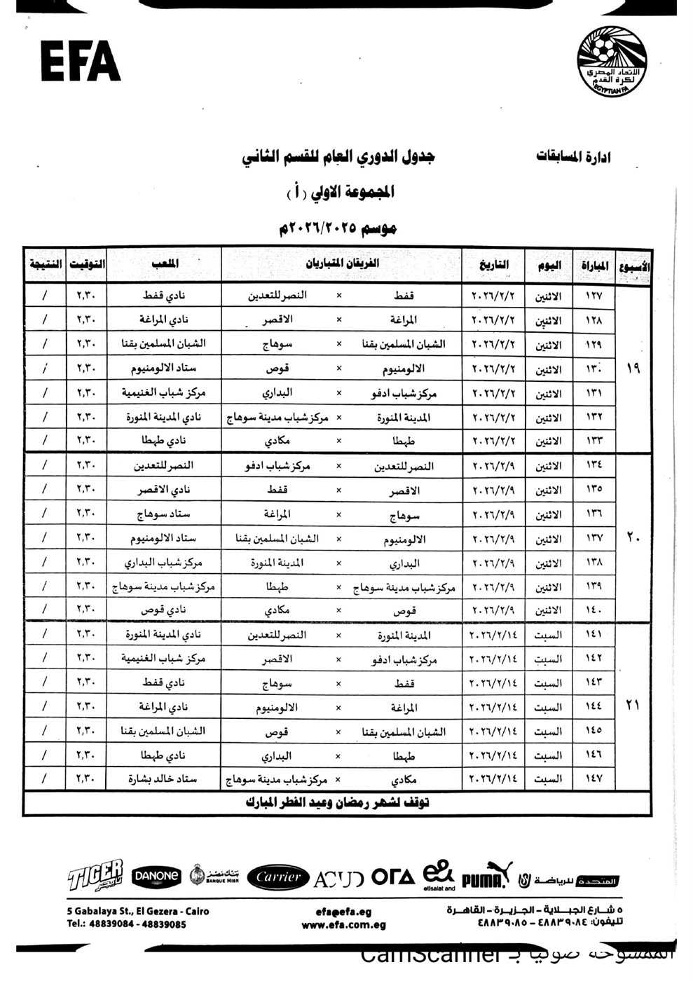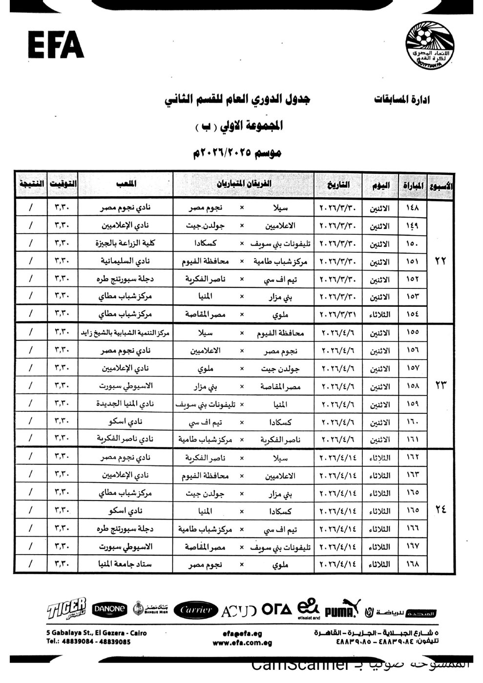 كشف اتحاد الكرة، جدول مباريات المجموعة الأولى لمسابقة دوري القسم الثاني ب للمجموعة الأولى أ وب مجموعتي الصعيد موسم 2025-2026.