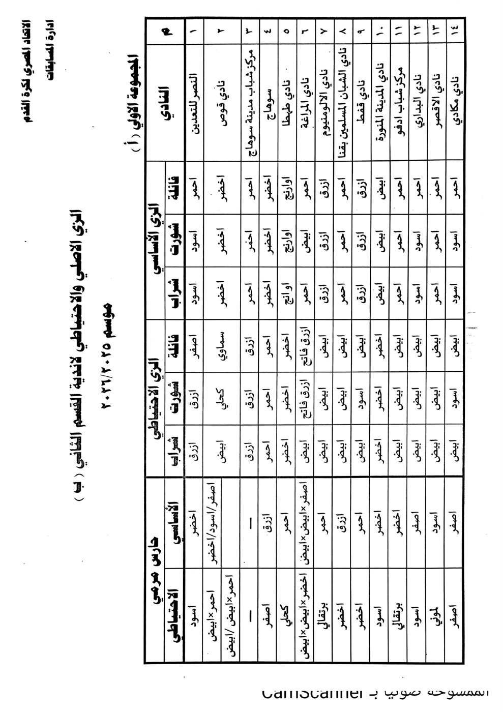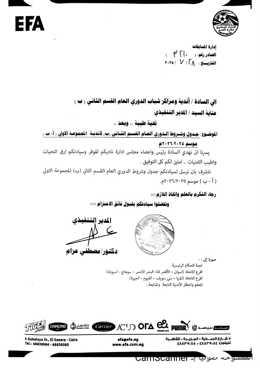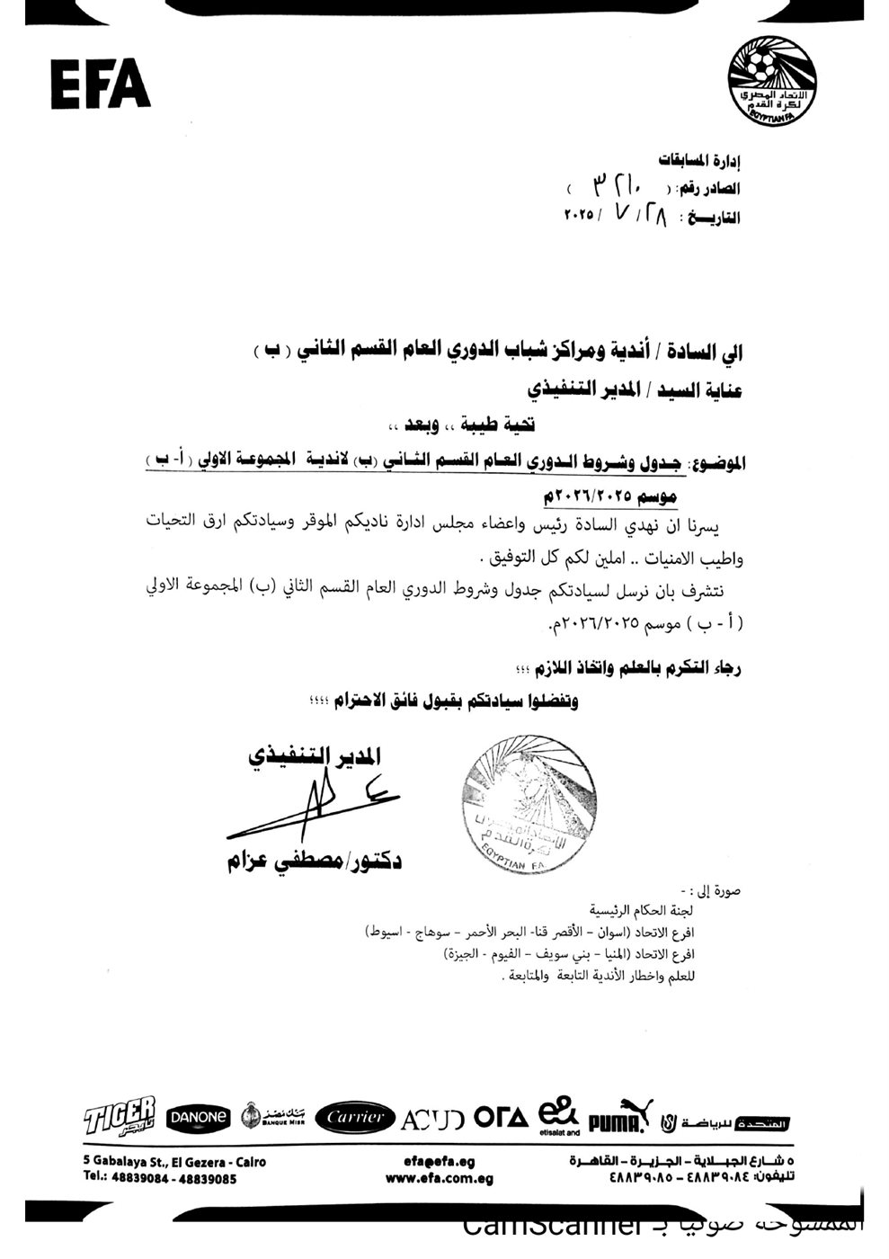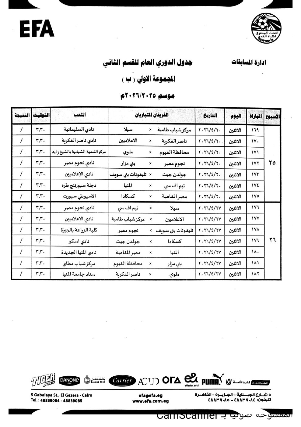 كشف اتحاد الكرة، جدول مباريات المجموعة الأولى لمسابقة دوري القسم الثاني ب للمجموعة الأولى أ وب مجموعتي الصعيد موسم 2025-2026.