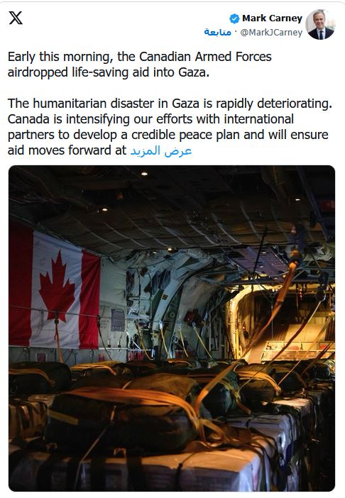 وذكرت هيئة البث الكندية أن هذه أول عملية إنزال جوي للمساعدات الإنسانية تنفذها القوات الكندية على القطاع باستخدام طائراتها.