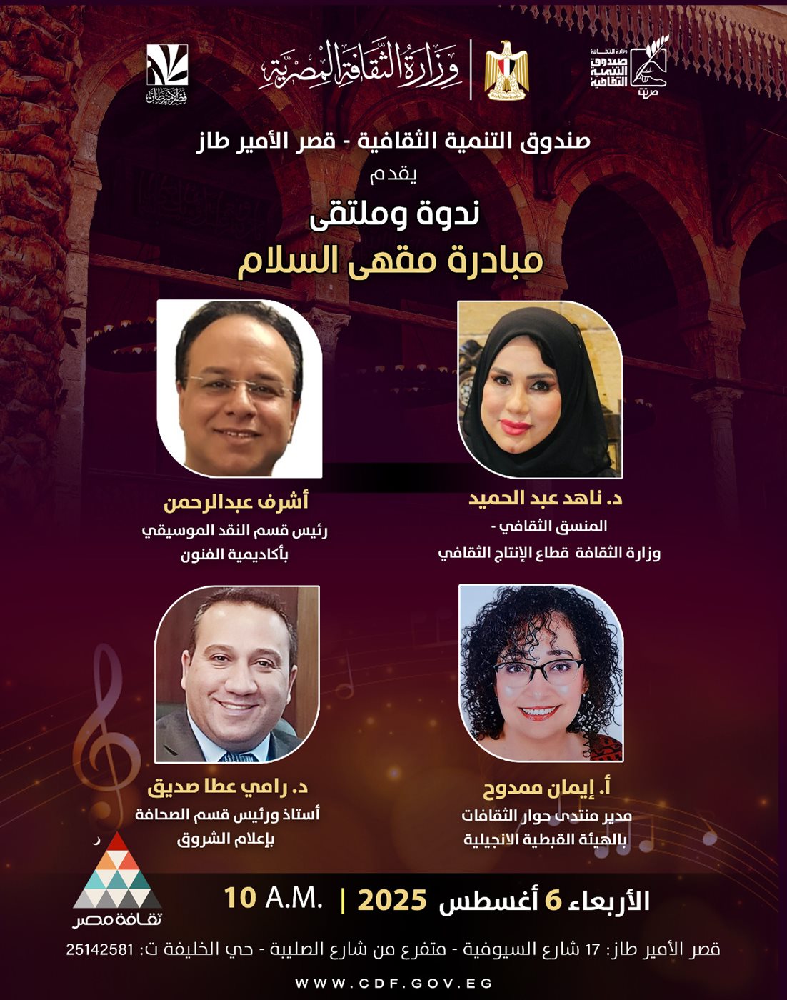 يُنظم صندوق التنمية الثقافية برئاسة المعمارى حمدي السطوحي، من خلال مركز إبداع قصر الاميز طاز ندوة وملتقى بعنوان "مبادرة مقهى السلام"، وذلك في تمام الساعة العاشرة صباح غدًا الأربعاء الموافق 6 أغسطس، بمقر قصر الأمير طاز بحي الخليفة.
