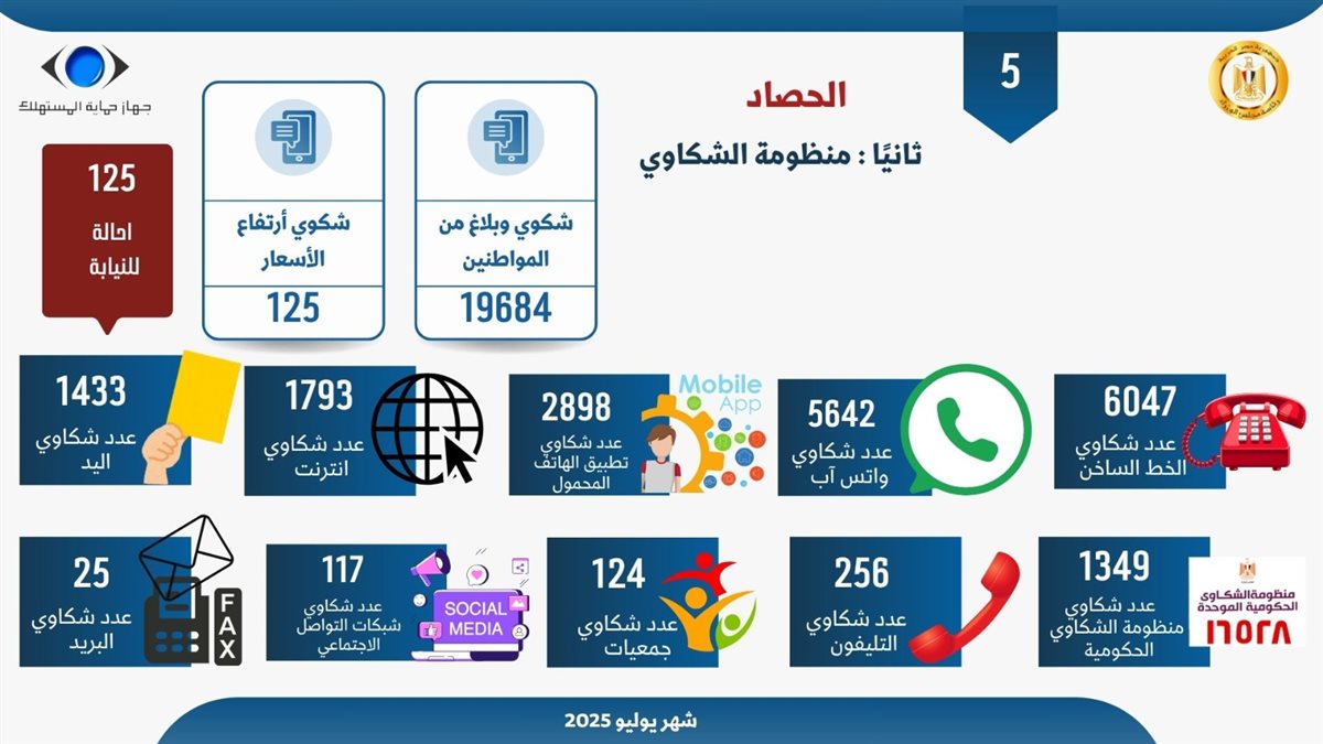 أوضح "السجيني" أن الجهاز تلقى خلال يوليو 19,684 شكوى من مختلف القطاعات، عبر وسائل التواصل المختلفة، أبرزها الخط الساخن، تطبيق الهاتف، ومواقع الإنترنت.
