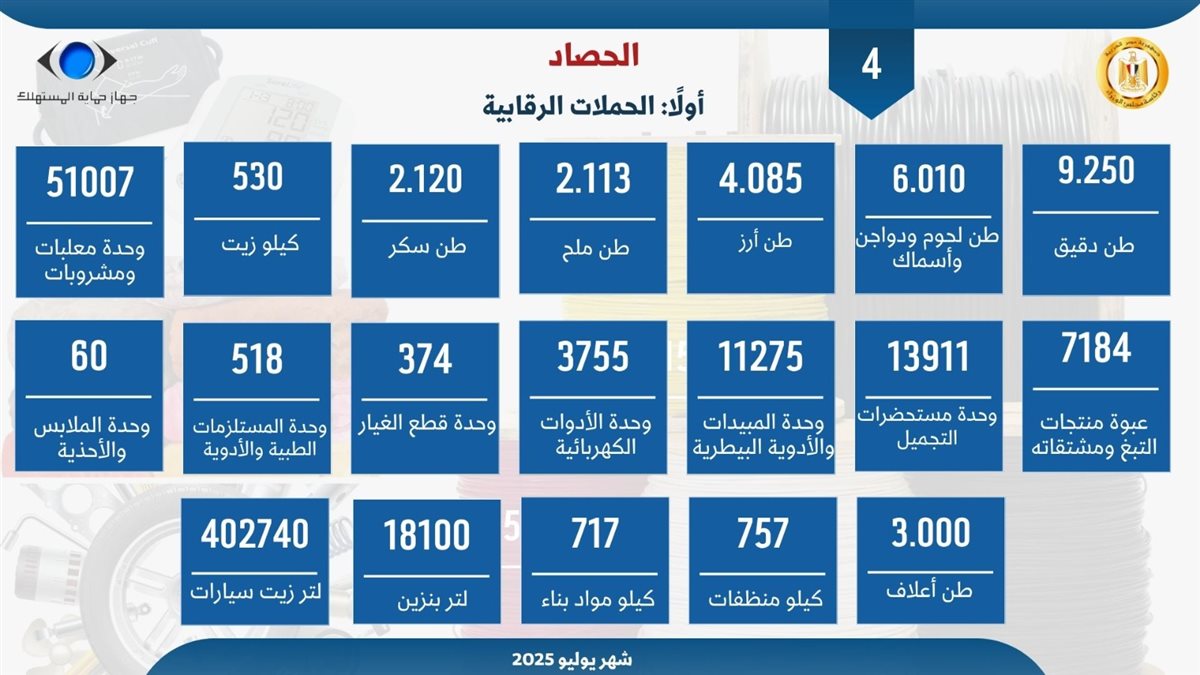 أعلن جهاز حماية المستهلك عن أبرز جهوده خلال شهر يوليو، في إطار تنفيذ توجيهات الدولة بضبط الأسواق ومنع التلاعب بالأسعار، وخاصة السلع الاستراتيجية، بالتنسيق مع كافة الجهات الرقابية، واستجابة لتكليفات دولة رئيس مجلس الوزراء بشأن تعزيز التوافق مع مجتمع التجار والصناع تمهيدًا لإطلاق مبادرة شاملة لخفض الأسعار.