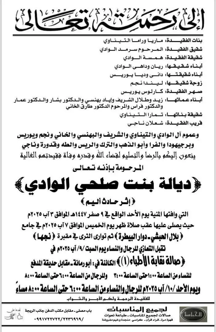 وأشارت الأسرة إلى أن تشييع جثمان الراحلة ديالة الوادي عقب صلاة الظهر في جامع بلال الحبشي، قبل أن تُوارى الثرى في مقبرة نجها بدمشق، وذلك يوم الخميس 7 أغسطس.