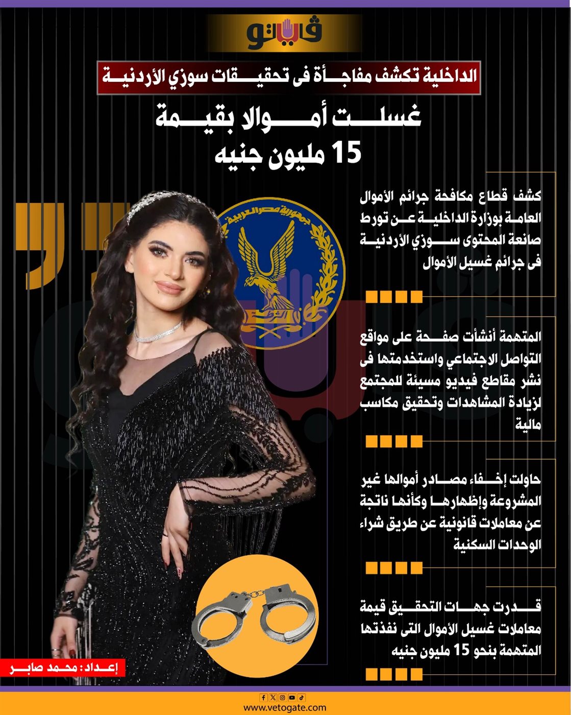 من بين النماذج ما تم مؤخرًا مع البلوجر المعروفة بــ “ سوزي الأردنية”، التي جرى ضبطها بعد استيفاء الإجراءات القانونية الكاملة، وجار التحقيق معها في عدد من الاتهامات التي تشمل غسل الأموال فى قضية بلغت نحو 15 مليون جنيه بالإضافة الى التحريض على الفسق.