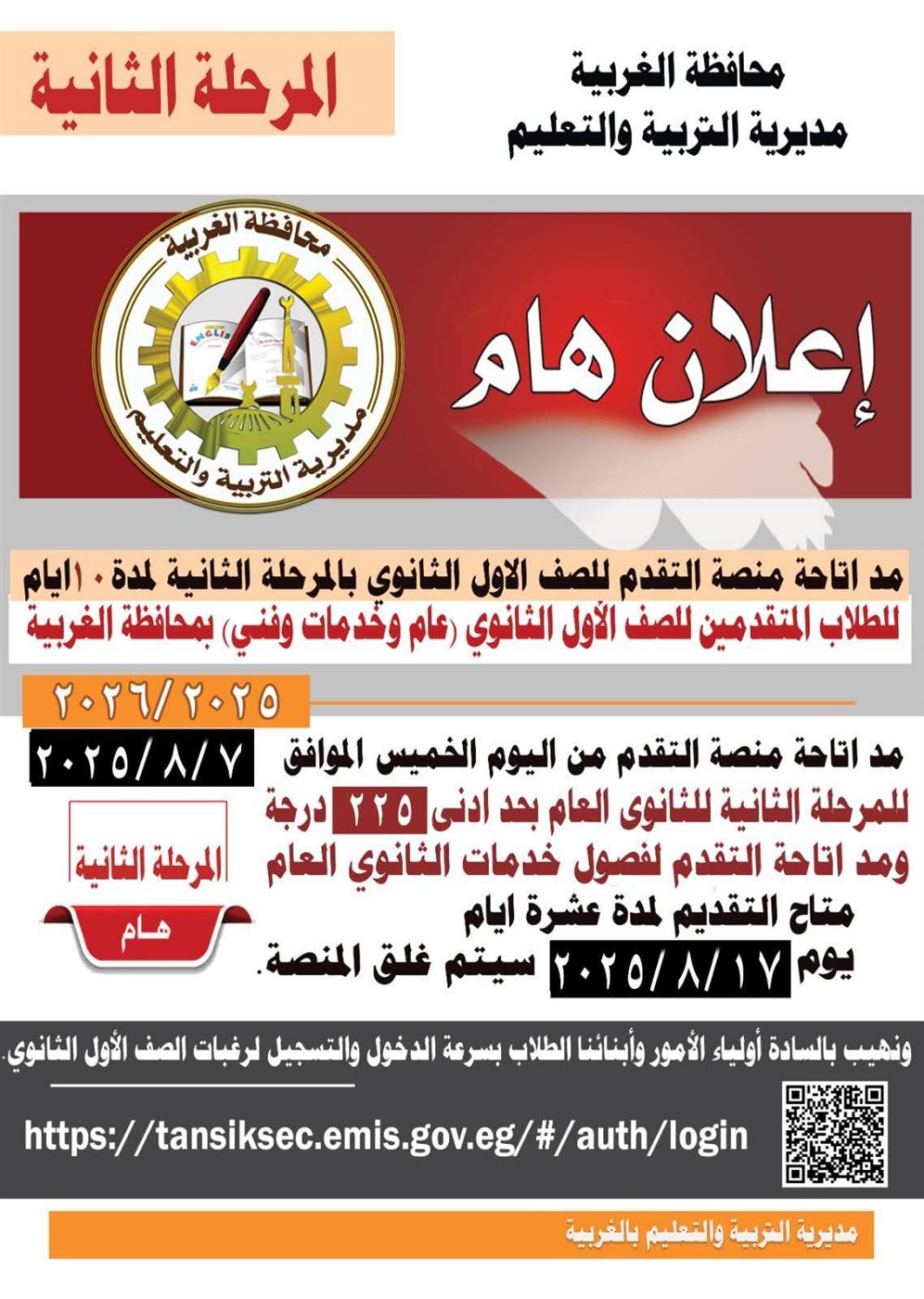 أعلن ناصر حسن وكيل مديرية التربية والتعليم بمحافظة الغربية عن مد فترة التقديم الإلكتروني للمرحلة الثانية للصف الأول الثانوي (عام وخدمات وفني) لمدة عشرة أيام إضافية تبدأ من اليوم الخميس الموافق 7 أغسطس 2025 وحتى 17 أغسطس 2025، وذلك عبر المنصة الإلكترونية الرسمية للتنسيق.