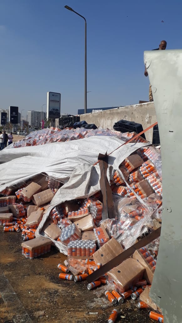 انقلاب سيارة نقل محملة بمياه غازية أعلى محور الشهيد (صور)