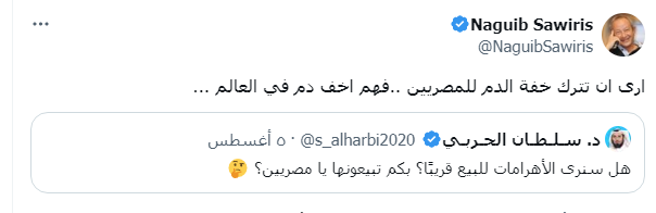 وأثارت تغريدة سلطان الحربي رفضًا واسعًا من المصريين، الذين طالبوه بعدم التحدث في الشأن المصري، وأن مصر لا تبيع حضارتها وتراثها بأموال العالم، وأن حضارة مصر لا يعرف قيمتها سوى المصريين.