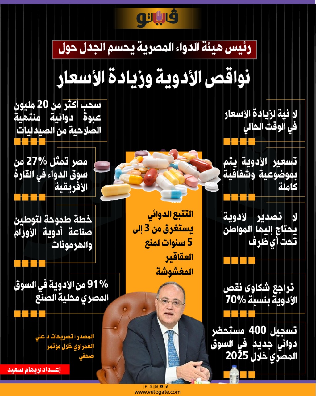 رئيس هيئة الدواء المصرية يحسم الجدل حول نواقص الأدوية وزيادة الأسعار (إنفوجراف)