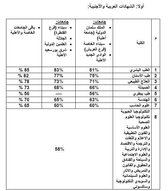 وبجامعات (سيناء "فرع القنطرة" - الجلالة - العلمين الدولية - شرق بورسعيد الأهلية) 65%.