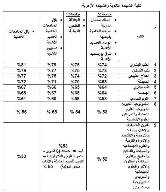 أما بالنسبة لطلاب الثانوية العامة أو الأزهرية، فقد جاءت الحدود الدنيا لكليات الطب والهندسة والإعلام كما يلي: