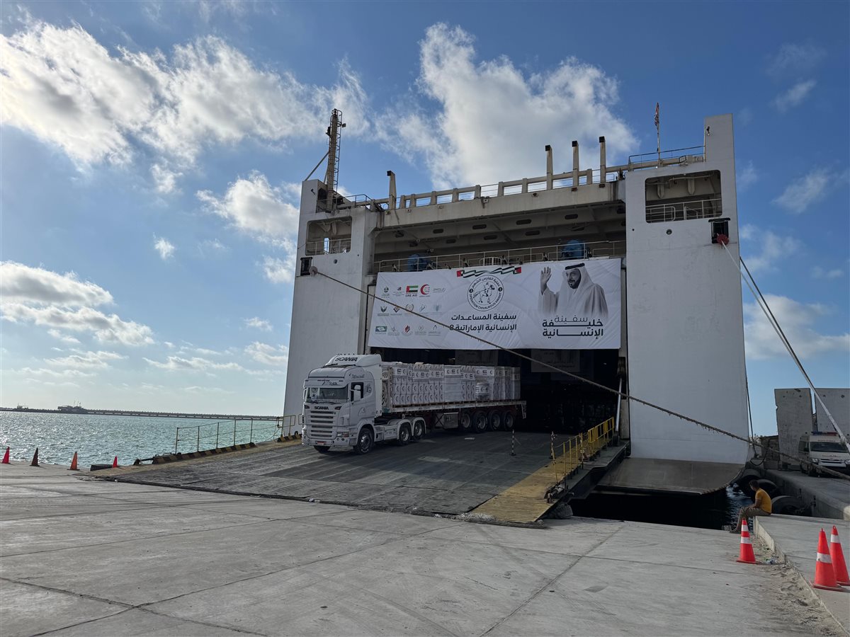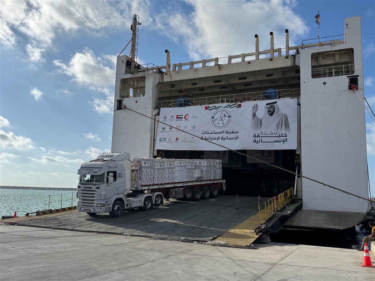 تفريغ السفينة الإماراتية "خليفة الإنسانية 8" بميناء العريش تمهيدًا لإدخال المساعدات إلى غزة